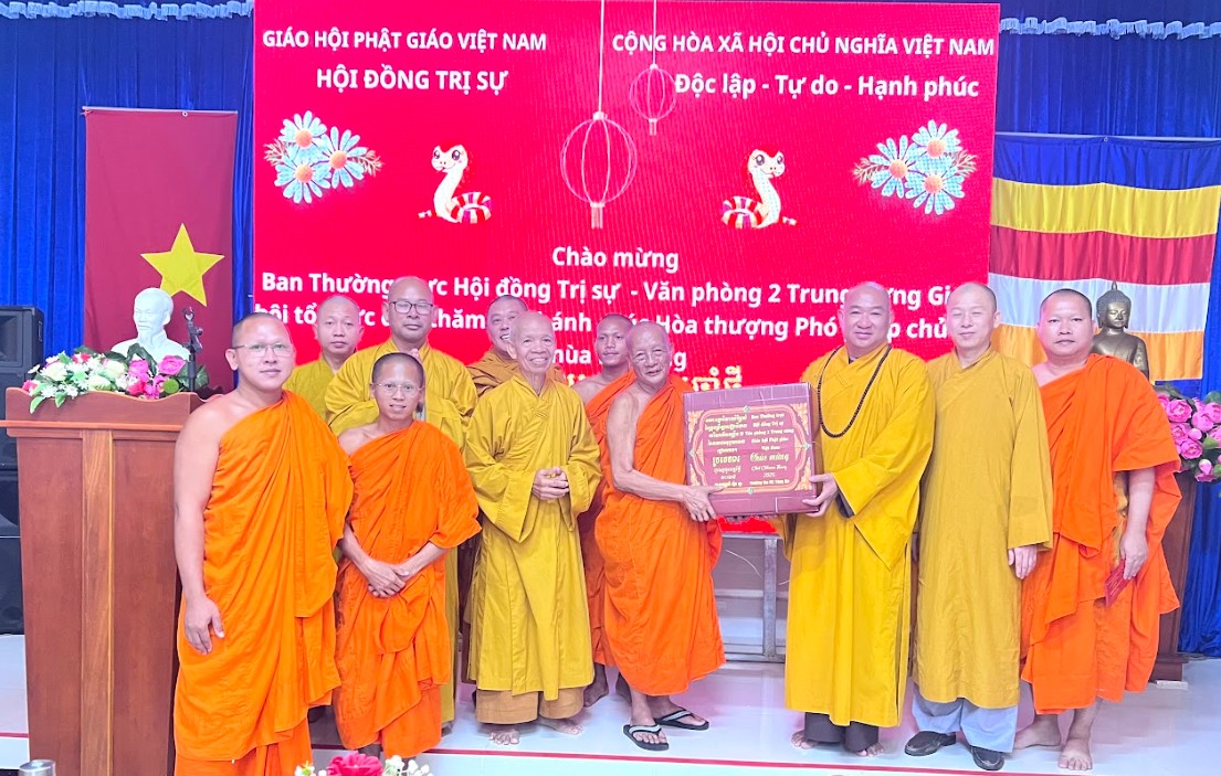 Chiều ngày 4/4/2025 (nhằm ngày 7/3 năm Ất Tỵ), đoàn chư Tôn đức Văn phòng 2 Trung ương Giáo hội Phật giáo Việt Nam thăm, chúc mừng Trưởng lão Hoà thượng Tăng Nô cùng chư Tôn đức Giáo phẩm lãnh đạo Phật giáo Nam tông khmer nhân dịp Tết cổ truyền Chôn Chnăm Thmây của đồng bào Khmer