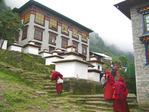Từ Phaplu nếu lội bộ lên Tu viện khoảng 10 tiếng đồng hồ lại cồng kềnh hành lý nên cả đoàn rủ nhau… bay. Phải 10 chuyến trực thăng mới tải hết 55 người, đám thanh niên phải bay trước để đón các “ama” bay lên sau. Tới sân bay của Tu viện Thubten đã có thầy Thắng đang tu học trên đây, một thầy tu người Châu Âu và vài tu sĩ cùng nhóm Phật tử trai tráng khuôn vác hành lý của những phụ nữ liễu yếu và của các “bô lão” chân mềm vai gầy. Tốp người thứ hai chúng tôi gặp là các Ni vừa đi chợ về, mỗi người gùi đến vài chục ký rau, củ, quả, các Ni chào chúng tôi với nụ cười hiền như thánh nữ.