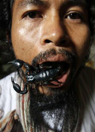 Bò cạp, sâu bọ và giun là món ăn thịnh hành ở Thái Lan, nhất là những khu vực miền bắc. Tuy nhiên, sau những tháng năm bày bán các món bò cạp, anh Suang Puangsri, một Phật tử, cảm thấy đây là thời gian để anh chuộc lại tội lỗi xưa bằng cách cư xử với bò cạp như là người bạn.