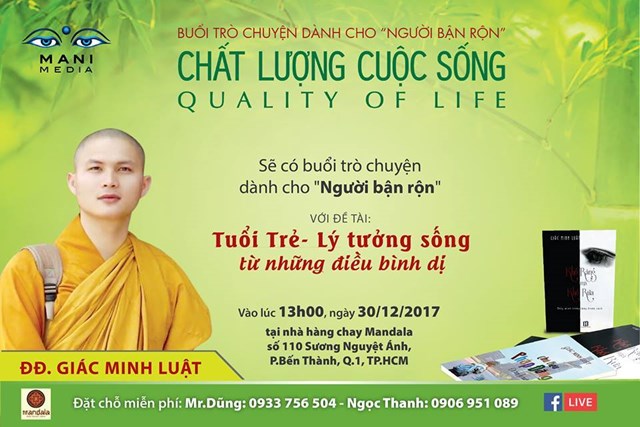 “Tuổi trẻ – Lý tưởng sống từ những điều bình dị” là đề tài của buổi Pháp thoại trong chương trình Chất lượng cuộc sống lần thứ 117 tại nhà hàng chay Mandala; số 110; Sương Nguyệt Ánh, Q.1 , TPHCM.