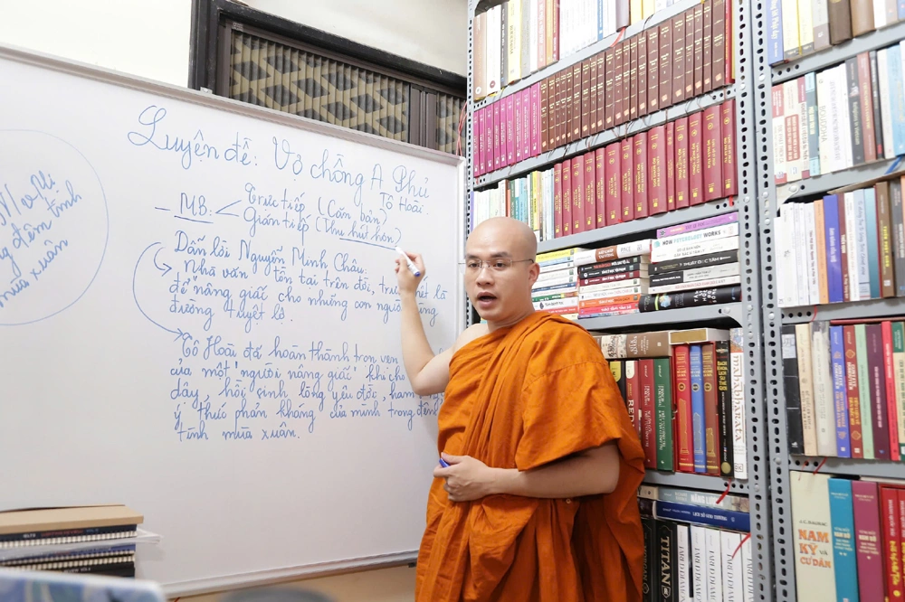 Với ba bằng đại học, thủ khoa thạc sĩ ngành Ngôn ngữ Anh, sư thầy Minh Giải ở chùa Huyền Không mở nhiều lớp dạy phát âm, giao tiếp cơ bản hay luyện thi tốt nghiệp THPT miễn phí.