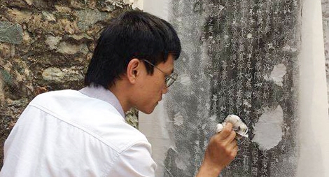 | Thạc sĩ Nguyễn Hữu Sử (Viện Nghiên cứu Tôn giáo) đang rập bia hậu Phật năm Chính Hòa 23 (1702) ở Thanh Tước.