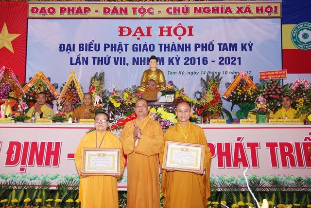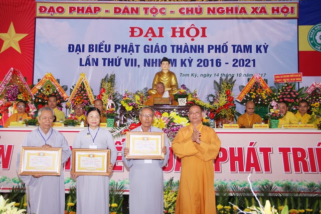 Dịp này, BTS GHPGVN tỉnh cũng đã trao tặng bằng tuyên dương công đức cho 2 tập thể và 5 cá nhân có nhiều nỗ lực đóng góp tích cực trong công tác Phật sự nhiệm kỳ qua của BTS PG TP.Tam Kỳ.