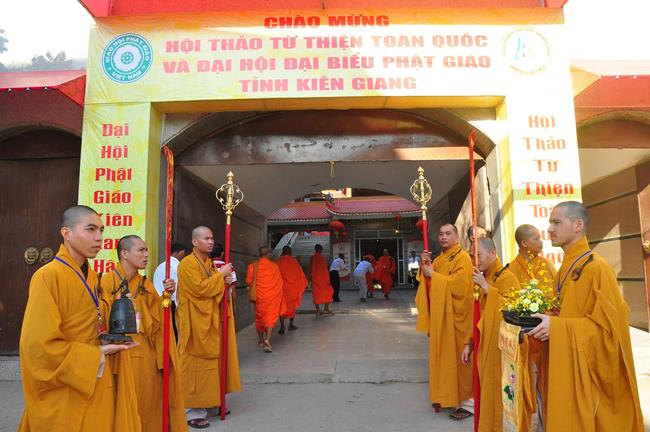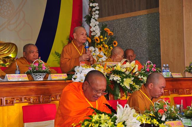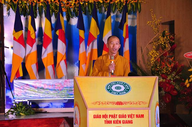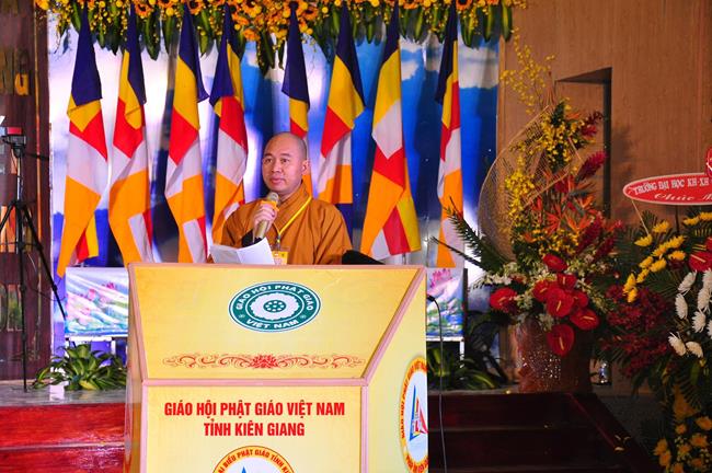Sau nghi thức niệm Phật cầu gia bị, chào quốc kỳ và đạo kỳ; tuyên bố lý do, giới thiệu thành phần tham dự, HT Thích Huyền Thông: UV HĐTS, Phó Trưởng ban Thường trực BTS GHPGVN tỉnh Kiên Giang phát biểu khai mạc. Hòa thượng cho biết: “Trong 05 năm qua, Phật giáo tỉnh nhà cơ bản đã hoàn thành nhiệm vụ được giao phó, nhiều Phật sự đã thành tựu viên mãn. Để phát huy những kết quả đạt được và khắc phục những Phật sự còn tồn đọng trong nhiệm kỳ qua, Phật giáo Kiên Giang cần có một Ban Trị sự mới với những thành viên có đầy đủ uy tín, đạo đức, kinh nghiệm, năng lực và trình độ để có thể hoạch định phương hướng hoạt động Phật sự vừa phù hợp với giáo lý đạo Phật, hiến chương GHPGVN, phát luật Nhà nước, nhất là sự chỉ đạo nhất quán của TWGH, vừa đáp ứng nhu cầu và nguyện vọng của các hệ phái thành viên của Giáo hội, của Tăng Ni Phật tử các tự viện”.