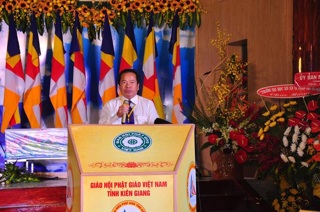 Ông Mai Văn Huỳnh: Phó Chủ tịch UBND tỉnh phát biểu chúc mừng Đại hội. Ông đánh giá cao sự đóng góp của Phật giáo Kiên Giang vào công cuộc xây dựng và bảo vệ tổ quốc, luôn đồng hành, gắn bó cùng dân tộc. Ông khẳng định sau hơn 40 độc lập, thống nhất, Tăng Ni Phật tử tỉnh Kiên Giang đã tiếp tục dấn thân vào vận mệnh mới của Đất nước, tích cực hưởng ứng nhiều phong trào thi đua yêu nước, nhiều cuộc vận động, do Đảng, Nhà nước, Mặt trận và các đoàn thể các cấp phát động, đặc biệt là hoạt động từ thiện, an sinh xã hội, về bảo vệ khí hậu, bảo vệ môi trường, đoàn kết tôn giáo. Trong nhiệm kỳ qua, có 55 vị Tăng Ni tham gia Đại biểu HĐND, 28 vị là ủy viên MTTQVN các cấp. Ông hy vọng nhiệm kỳ sau, Ban Trị sự tiếp tục phát huy hơn nữa để góp phần xây dựng quê hương Đất nước ngày càng văn minh, giàu đẹp.