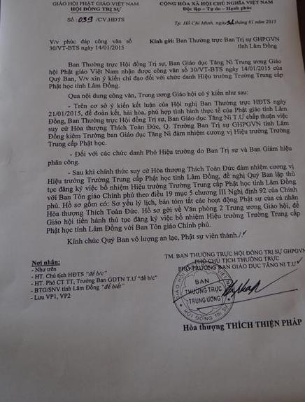 HT. Thích Thiện Pháp, Phó chủ tịch thường trực HĐTST.Ư – phó trưởng Ban giáo dục Tăng Ni T.Ư GHPGVN, thay mặt Ban thường trực HĐTS GHPGVN vừa ký công văn số 039/CV.HĐTS ngày 31/01/2015 về việc : Ban thường trực HĐTS, Ban Giáo Dục Tăng Ni T.Ư chấp thuận việc suy cử HT. Thích Toàn Đức, Quyền Trưởng Ban Trị Sự GHPGVN tỉnh Lâm Đồng kiêm Trưởng Ban Giáo Dục Tăng Ni đảm nhiệm cương vị Hiệu trưởng trường Trung Cấp Phật Học Lâm Đồng .