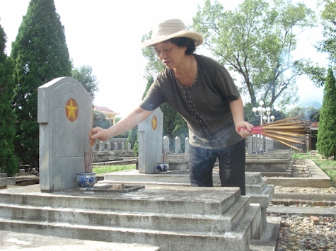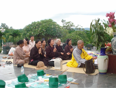 Lần này đich thân thầy Thích Như Hiền làm trưởng đoàn. Thấy đoàn hầu hết là người cao tuổi lại đi dòng dã một đêm suốt chặng đường dài, chị Hồng Ngọc, chánh văn phòng Báo Điện Biên Phủ có đề nghị sư thầy và đoàn về khách sạn nghỉ ngơi cho lại sức. Nhưng sư thầy không đồng ý, sư thầy nói : “Đêm qua, trên đèo Pha Đin, lái xe cũng đề nghị cho nghỉ lại, song vì đã thầm hẹn với vong linh các chiến sĩ, nên dù lý do gì cũng không thể để lỡ hẹn. Chính vì thế mà chúng tôi đã được phù hộ đi đến nơi bình an vô sự, ai cũng khoẻ mạnh. Cảm ơn các bạn đã quan tâm, nhưng xin cho chúng tôi ra nghĩa trang ngay để còn làm lễ”. Vậy là sau khi mọi người đã rửa mặt mũi chân tay cho tỉnh táo, các anh chị ở Báo dẫn đoàn đến Nghĩa trang Đồi A1.  Đúng 9 giờ 30, tiếng chuông mõ của sư thầy đã vang lên thỉnh Phật về chứng giám và để chào mời tất cả các chiến sĩ về tụ hội. Trời Điện Biên như đồng cảm và ủng hộ việc làm của đoàn. Ở Hà Nội, tiết trời oi bức bao nhiêu thì ở Điên Biên tiết trời dịu mát bấy nhiêu, làm cho chúng tôi ai nấy cảm thấy như được tăng thêm sức lực. Vì vậy sau một giờ cả đoàn tụng kinh câu cho các vong linh chiến sĩ được Phật gia hộ sớm được siêu thoát, chúng tôi lại toả đi thắp nhang cho tất cả các phần mộ. Khi đi thắp nhang, chúng tôi không khỏi bùi ngùi vì có rất nhiều mộ vô danh. .