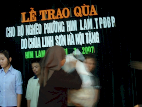 Sáng hôm sau, trời như thử thách tấm lòng thành của mọi người.  Mưa tầm tã từ 3 giờ sáng. Mưa mỗi lúc càng to hơn, mặc dù vậy không cản được đoàn tiếp tục lên đường. Được anh Hoàng Văn Thành, Tổng biên tập báo Điện Biên Phủ đích thân dẫn đường chúng tôi lần lượt che mưa vác quà vào từng bản và phát đến tận tay từng hộ nghèo ở các phường Thanh Trường, Him Lam, Noọng Bua và xã Thanh Minh (thành phố Điện Biên Phủ) và các xã Núa Ngam, Thanh Nưa và Sam Mứn huyện Điện Biên. Số quà tuy nhỏ, trị giá khoảng 30 triệu đồng, nhưng nó là tấm lòng hảo tâm của những người con Phật, những Phật tử thành phố Hà Nội đối với đồng bào các dân tộc đặc biệt khó khăn  của tỉnh Điện Biên