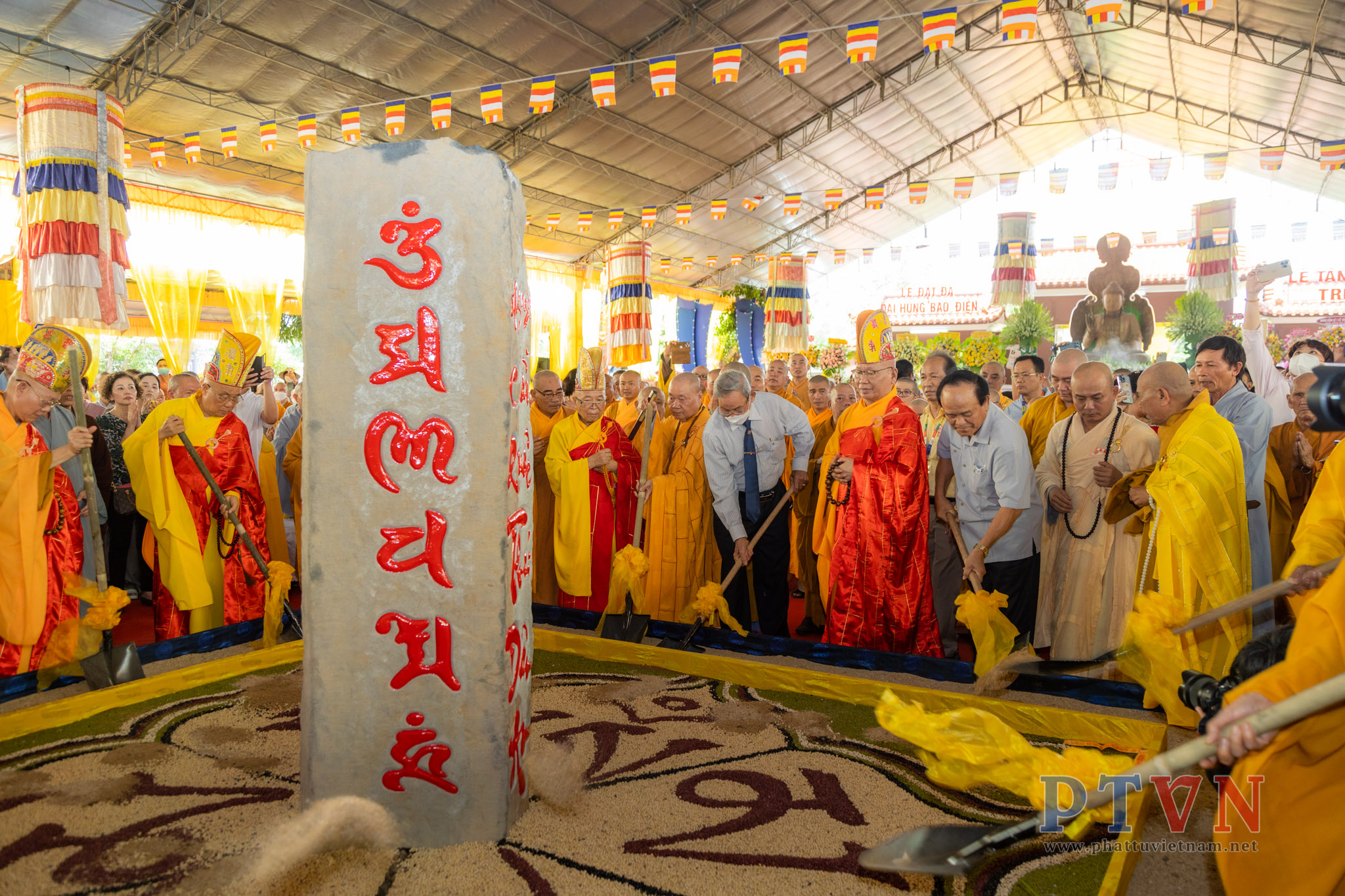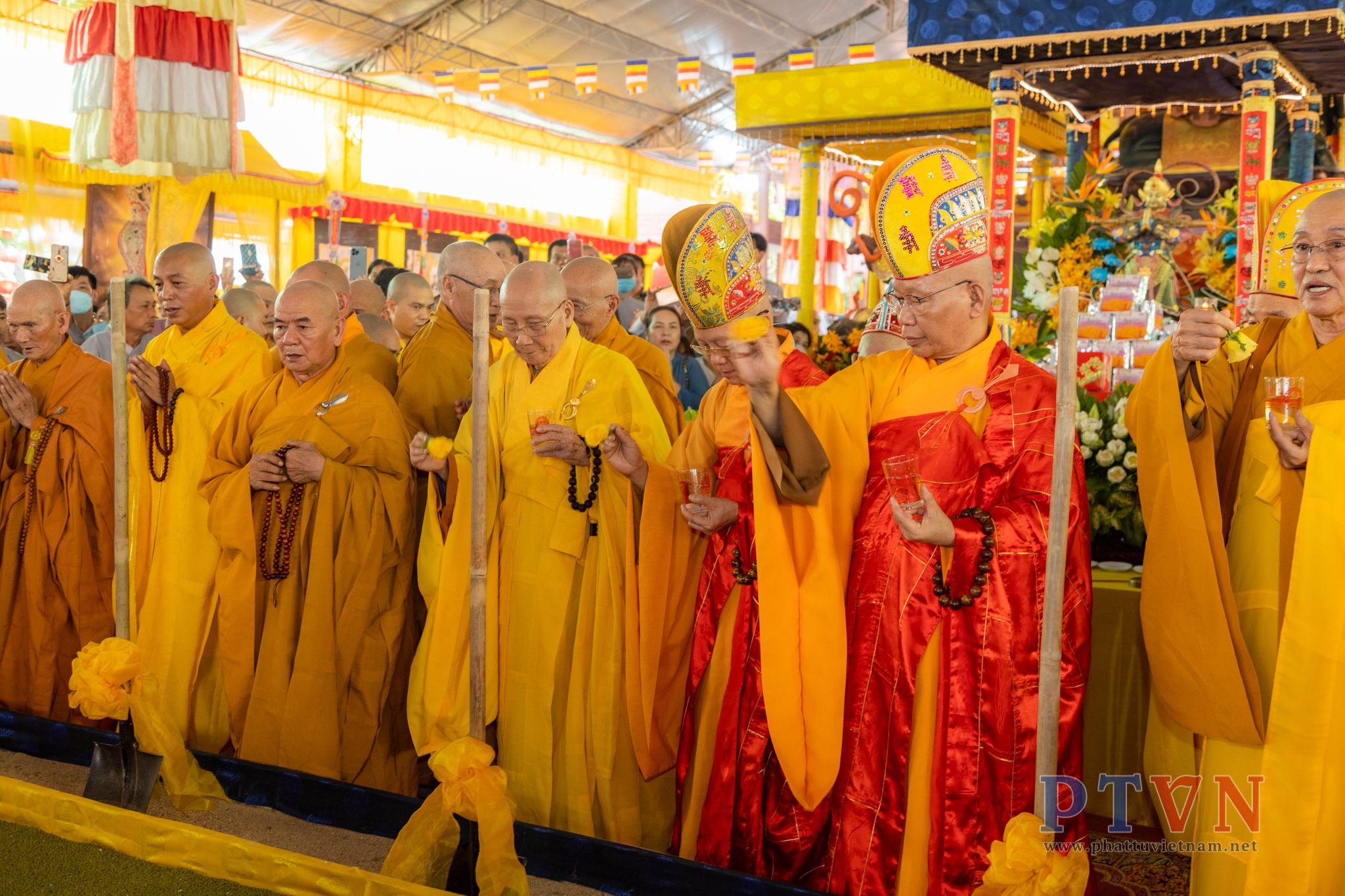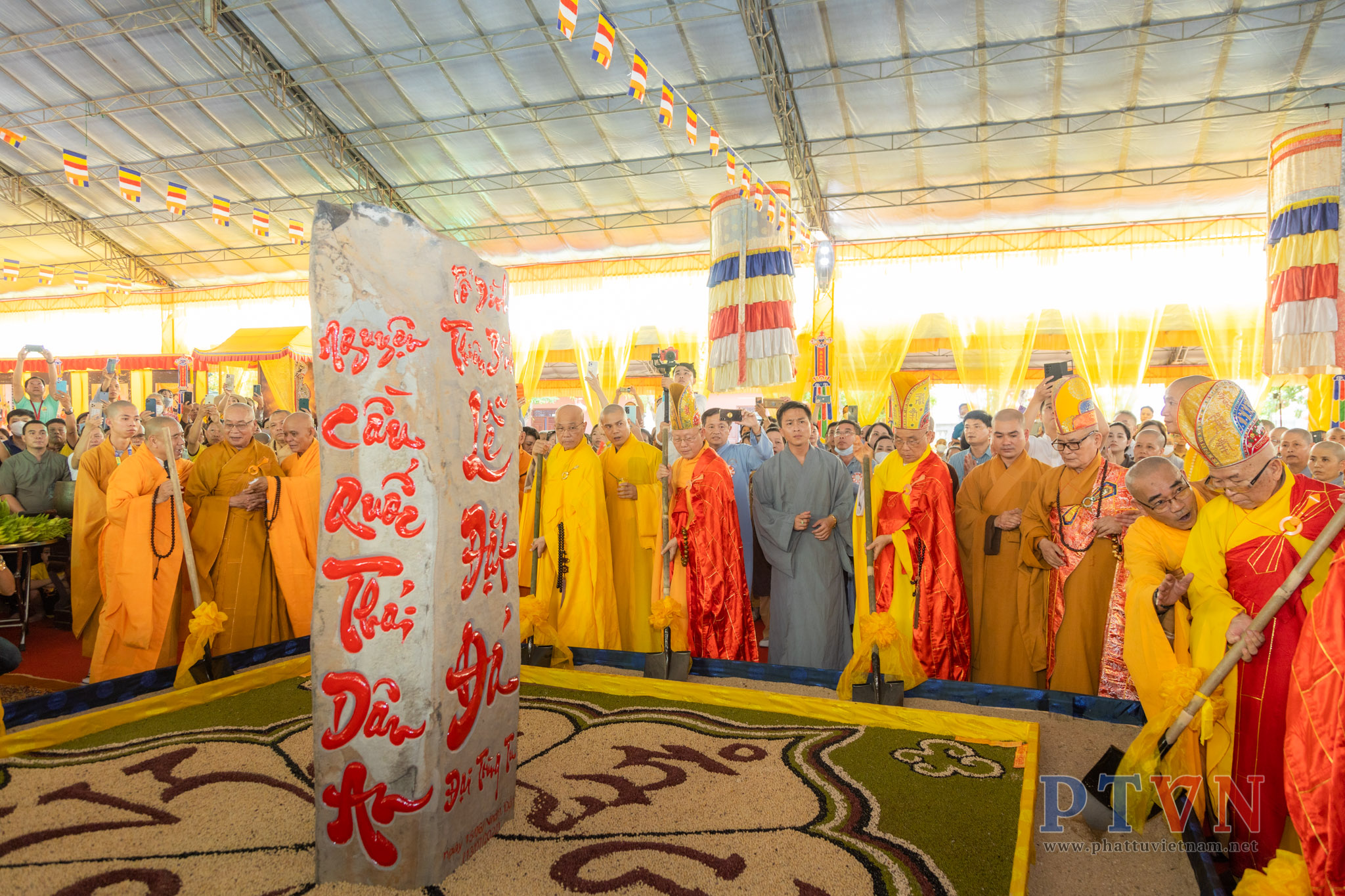 Tiếp đó, Ban Tổ chức đã cung thỉnh chư tôn Hoà thượng quang lâm tiến hành nghi thức niệm hương, sái tịnh đặt đá đại trùng tu ngôi Bảo điện Tổ đình Thiên Bình.