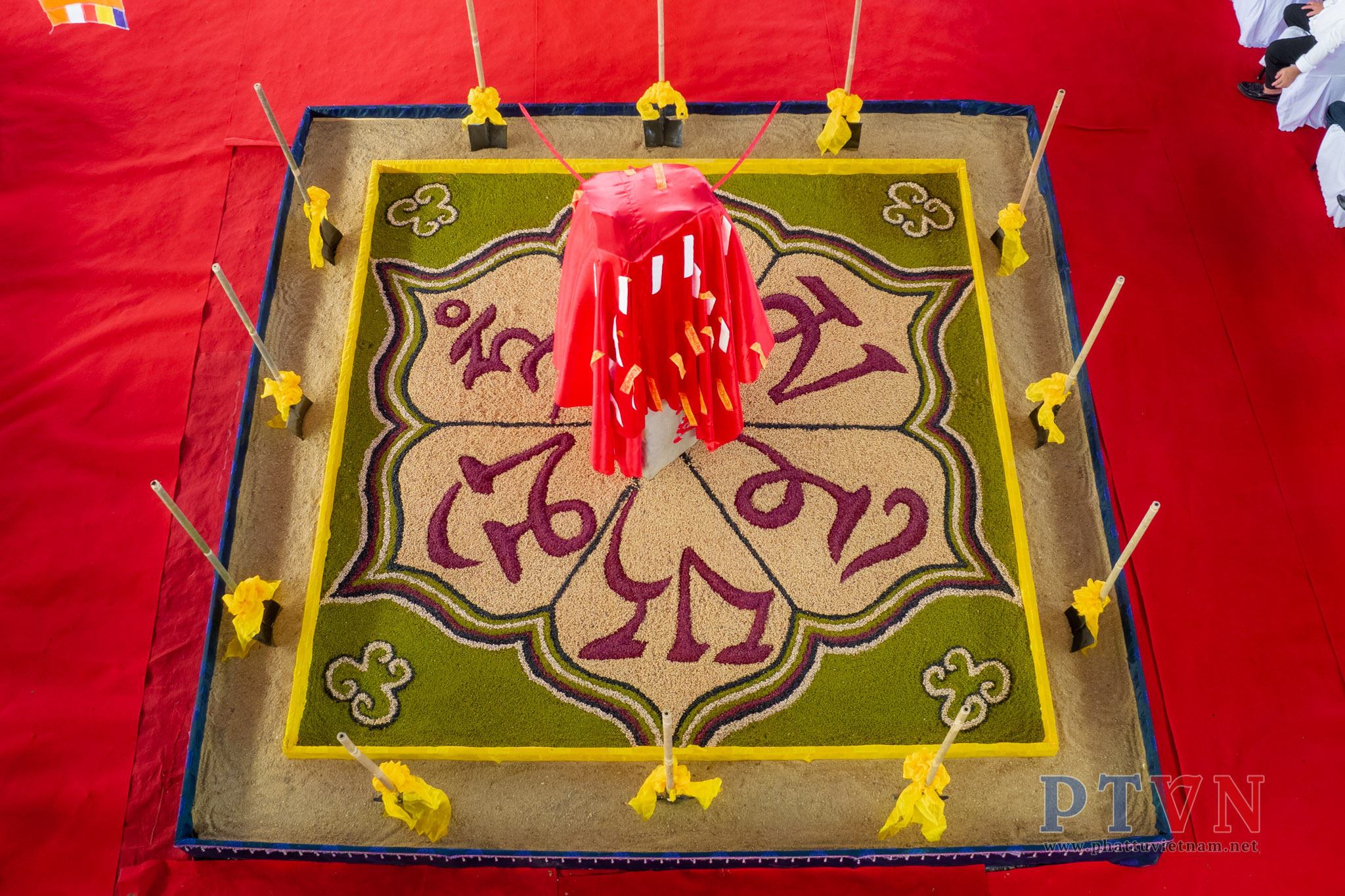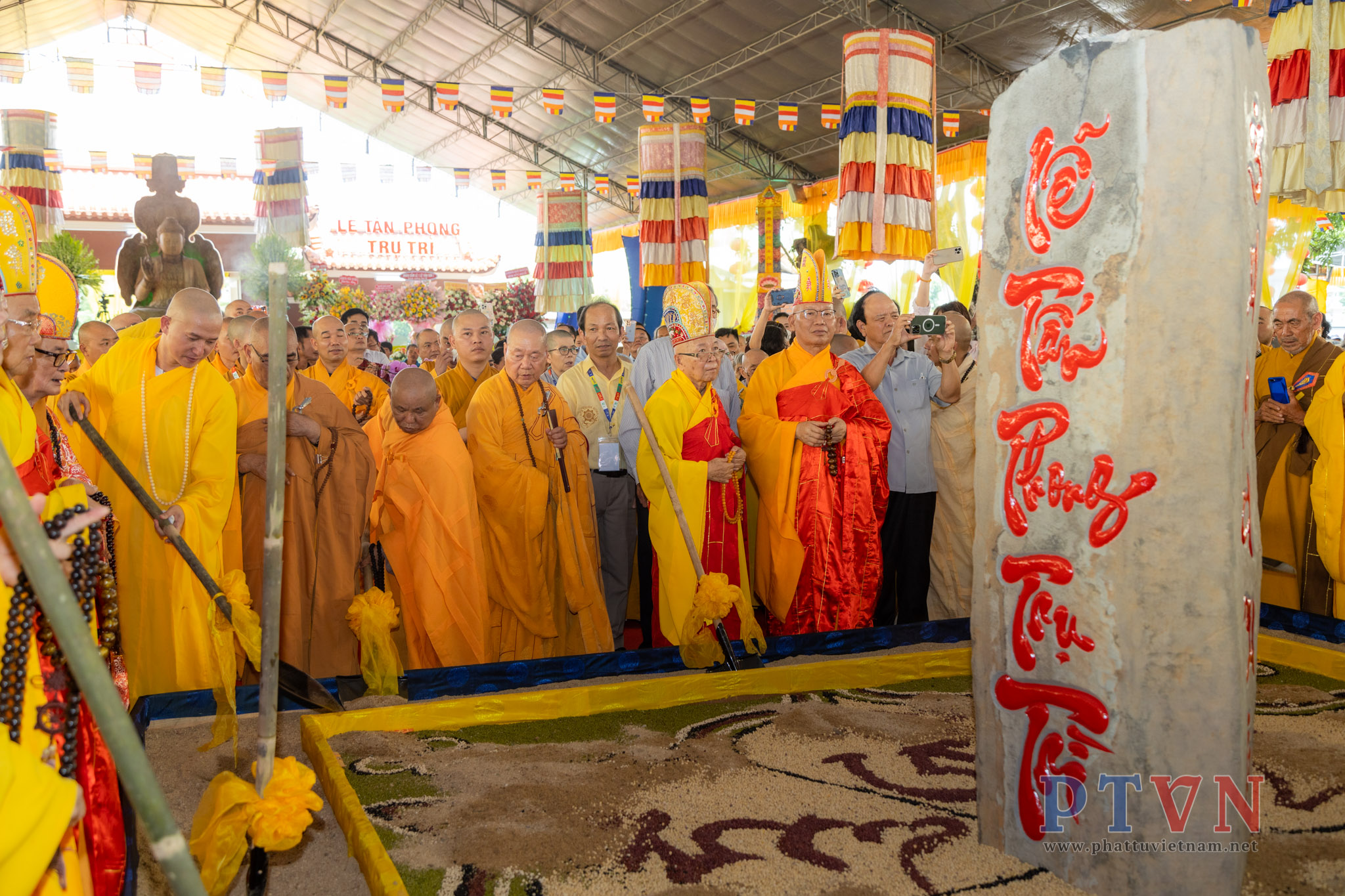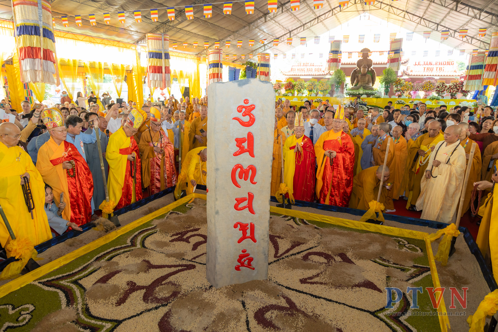 Tiếp đó, Ban Tổ chức đã cung thỉnh chư tôn Hoà thượng quang lâm tiến hành nghi thức niệm hương, sái tịnh đặt đá đại trùng tu ngôi Bảo điện Tổ đình Thiên Bình.