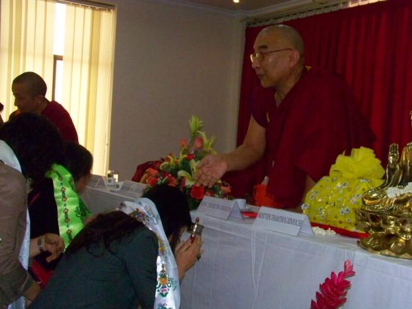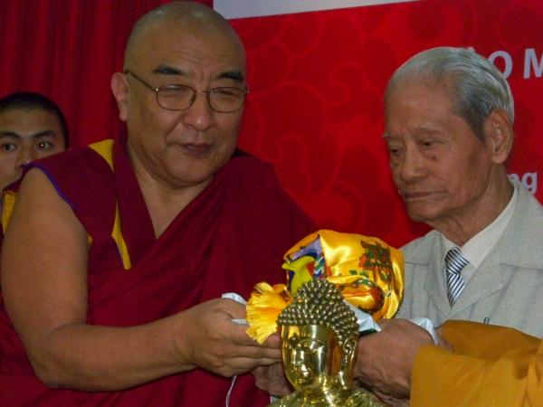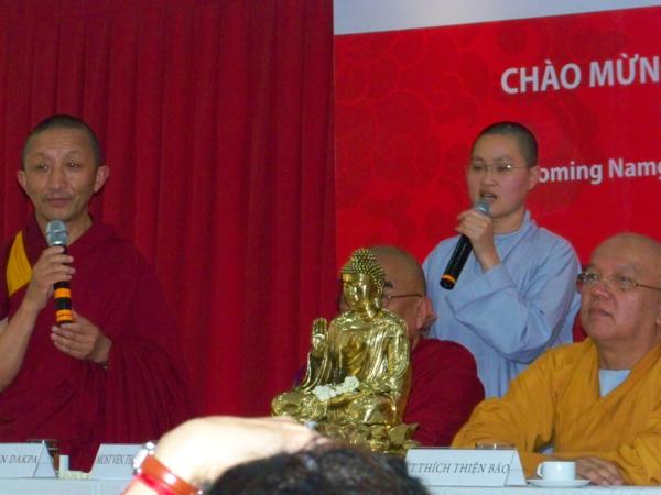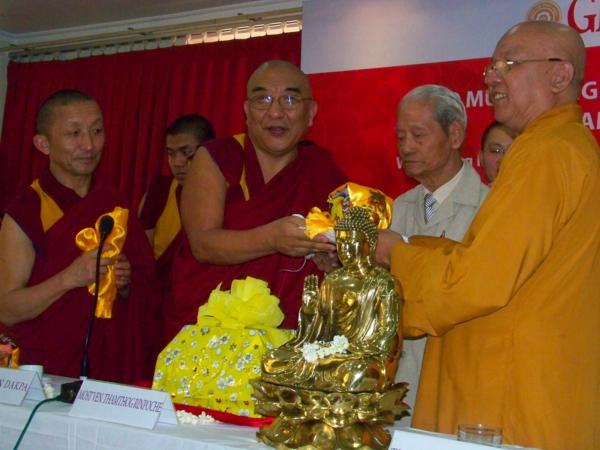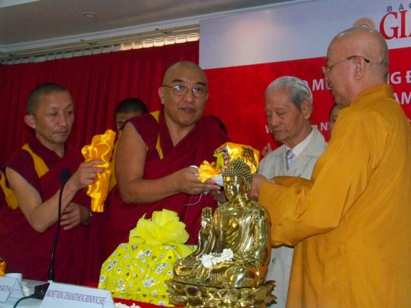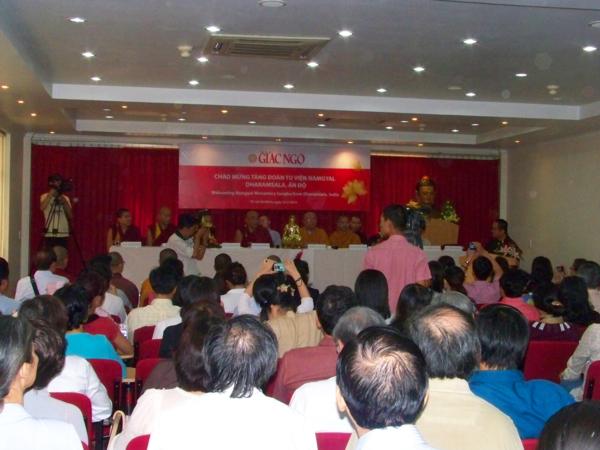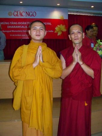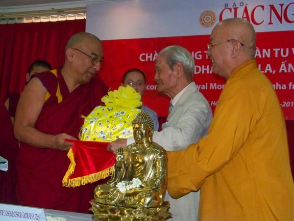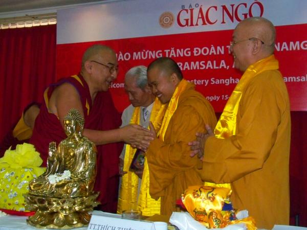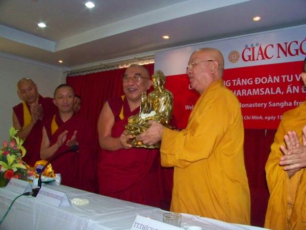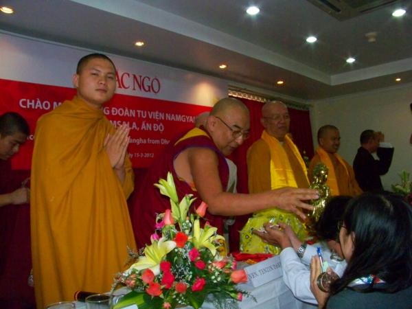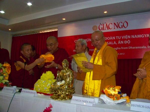 Đáp lại lời, thay mặt Tăng đoàn tu viện Namgyal – Dharamsala ngài Ngài Viện trưởng Thamthog Rinpoche bày tỏ những tình cảm mà BTC dành đón tiếp đoàn. Trong lễ tiếp đón, hai bên đã chia sẻ những kinh nghiệm quý báu khi làm Phật sự, hoằng pháp và trải nghiệm đường lối tu tập của những tông phái cũng như phương thức hành trì. Cuối cùng hai bên đã tặng những quà Văn hóa phẩm Phật giáo để lưu niệm trong sự hoan hỷ và ấm áp trong tình thân ái.