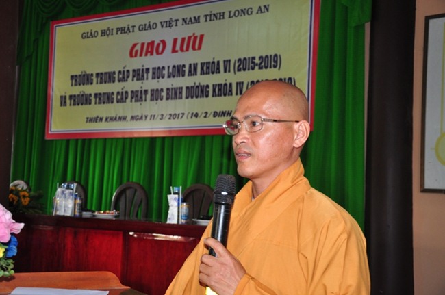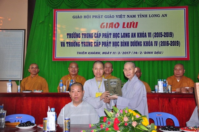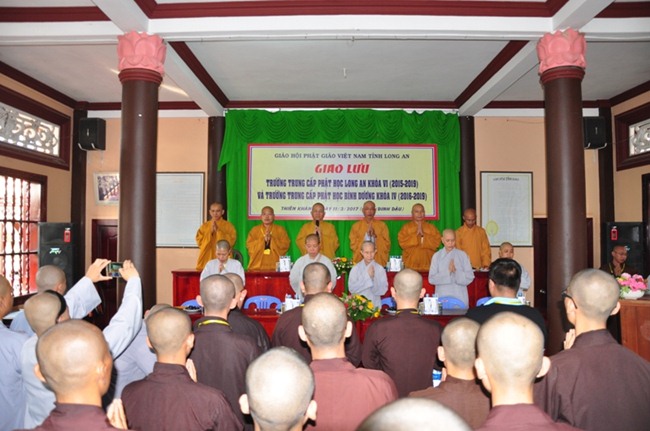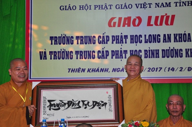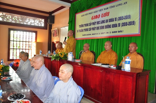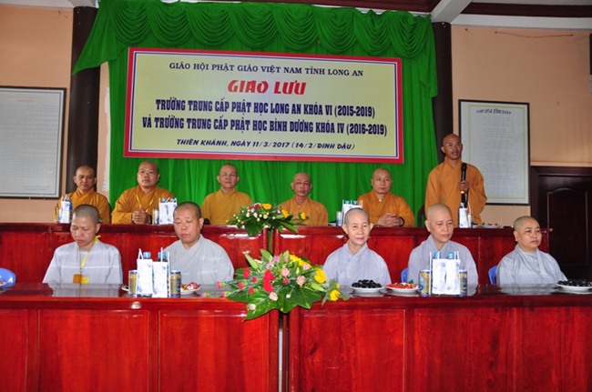 Buổi giao lưu, có sự hiện diện của HT Thích Thiện Huệ – Cố vấn chứng minh trường TCPHLA; HT Thích Minh Thiện – Trưởng ban BTS GHPGVN tỉnh Long An, hiệu trường trường TCPHLA; TT Thích Chơn Phát – Phó ban BTS GHPGVN tỉnh Bình Dương, hiệu trưởng trường TCPHBD; ĐĐ Thích Lệ Trí – Chánh thư ký BTS GHPGVN tỉnh Long An, hiệu phó học vụ trường TCPHLA cùng chư tôn đức trong ban giám hiệu của hai trường.