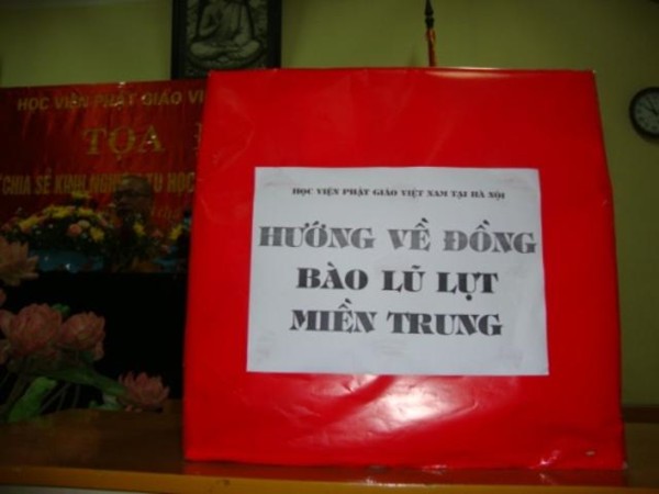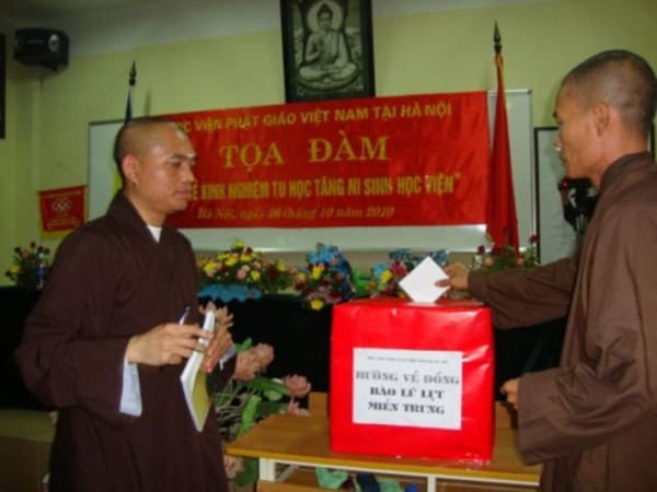 Trong buổi toạ đàm, Văn phòng Học Viện cũng phát động toàn thể chư tôn đức lãnh đạo HĐĐH – Văn phòng Học viện, Tăng Ni sinh ủng hộ một phần vật chất kinh tế cho đồng bào bão lụt miền trung. Toàn bộ số tiền ủng hộ, cùng số tiền Học Viện khuyên góp được, Văn phòng Học viện trực tiếp tổ chức đem vào tận miền trung trao tặng cho đồng bão lũ lụt.
