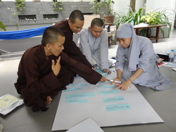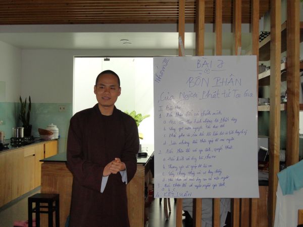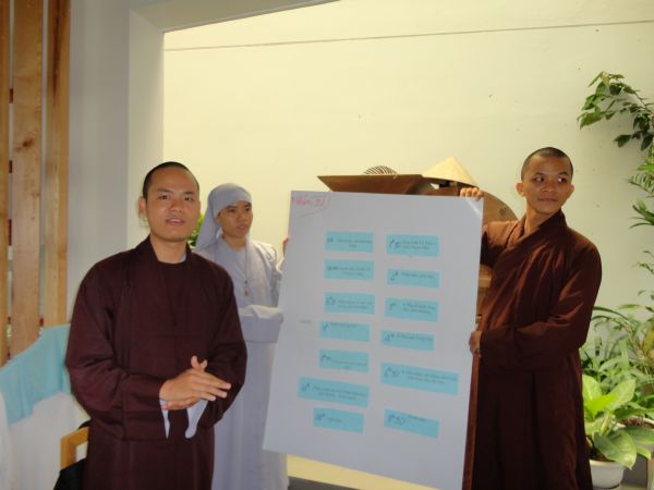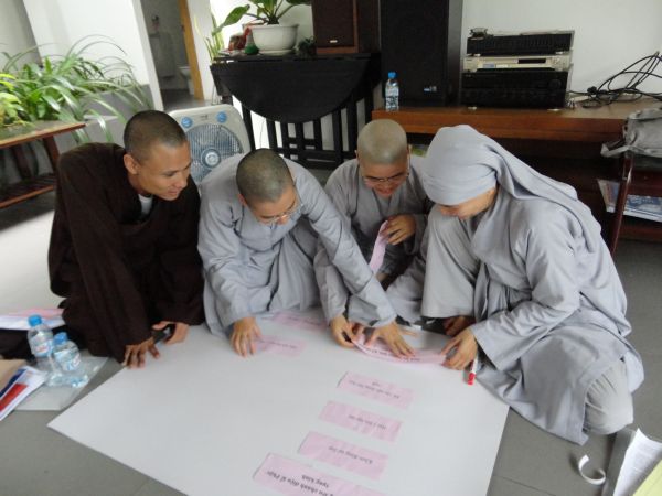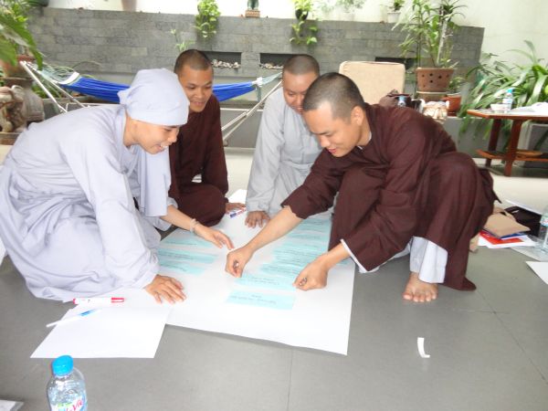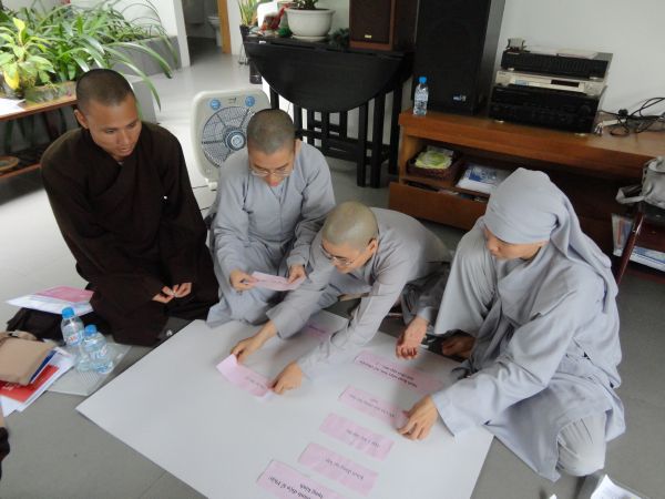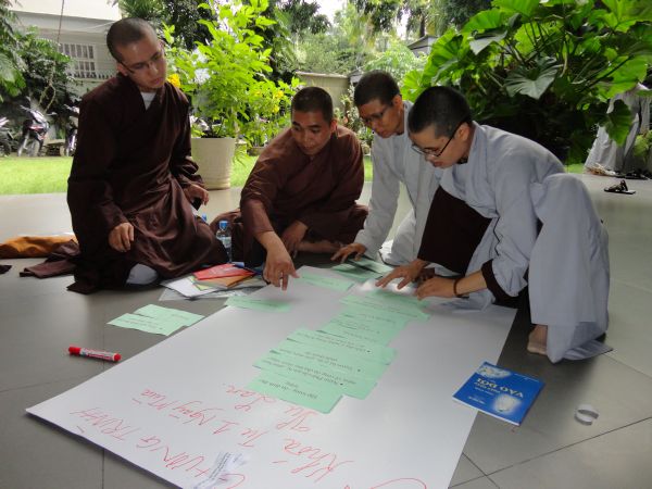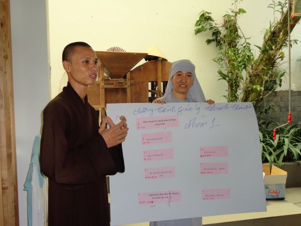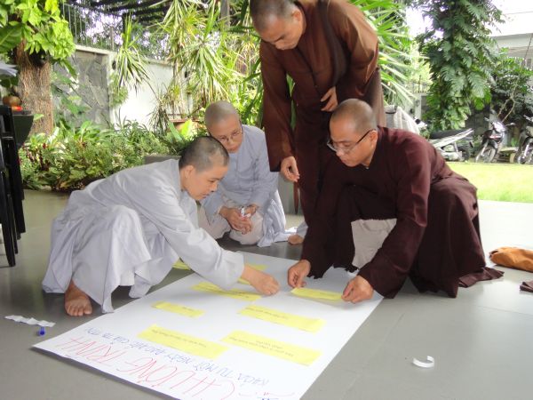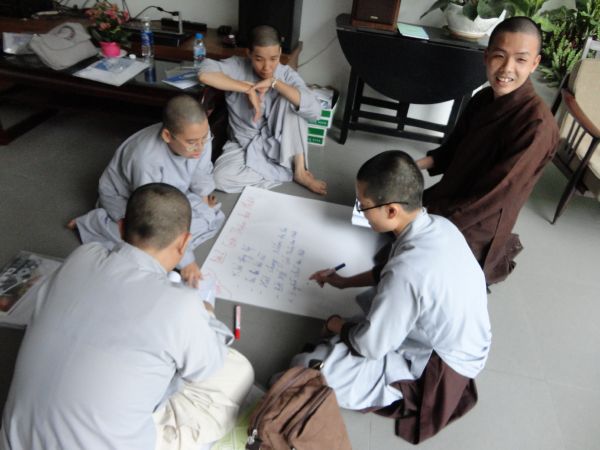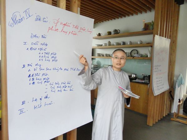 Buổi chiều cùng ngày các nhóm bắt đầu làm việc lúc 13h00. Tiếp tục chia nhóm, bốc thăm đề, phát giấy A0, bút long và thảo luận trên giấy A0 10 phút, sau đó thực tập trực tiếp một buổi dạy học cho các em thanh thiếu niên trong giáo trình Phật pháp vào đời tập 1 mà Hoằng Pháp Trẻ đã biên soạn. Quý thầy cô sẽ lấy hội trường tập huấn làm lớp học, giảng dạy y như mình đang đứng trước một lớp học thực thụ. Các em học sinh cũng sẽ đặt câu hỏi và đưa những vấn đề thắc mắc lên cho vị giảng sư,… Sau mỗi nhóm thuyết trình đều có những phút giây bình chọn A, B, C cho nhóm nào xuất sắc nhất. Tạo sự sôi nỗi, vui vẻ, hòa đồng giữa các nhóm.