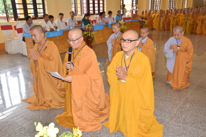 ĐĐ. Thích Huệ Chơn – Phó thư Ký kiêm Chánh Văn phòng BTS GHPGVN tỉnh Tây Ninh điều phối chương trình và tuyên đọc quyết định khen thưởng cho các giới tử đã đạt thành tích xuất sắc, thay mặt BTC có lời Cảm tạ Tri ân Chư Tôn Đức và chính quyền các cấp.