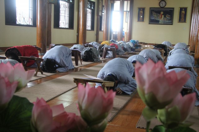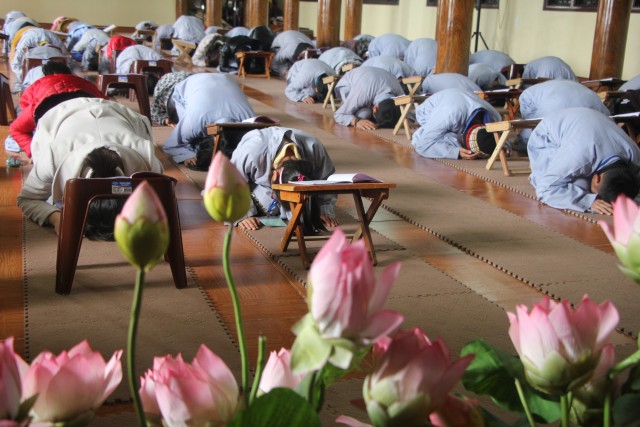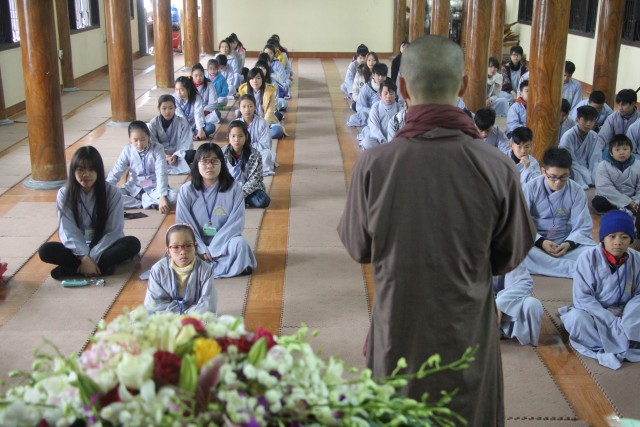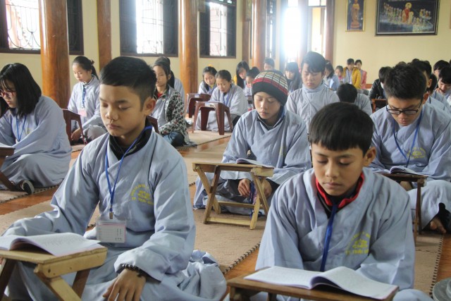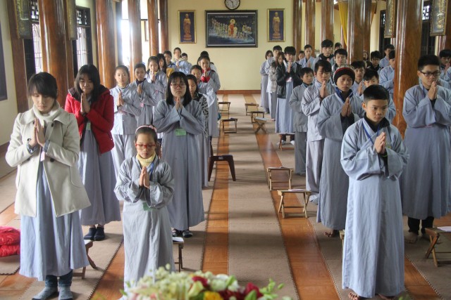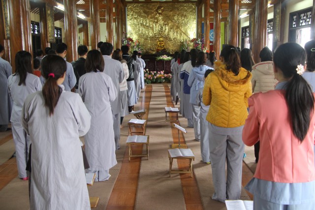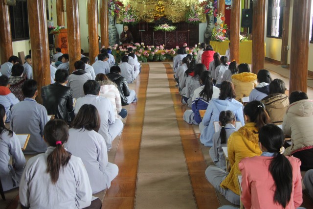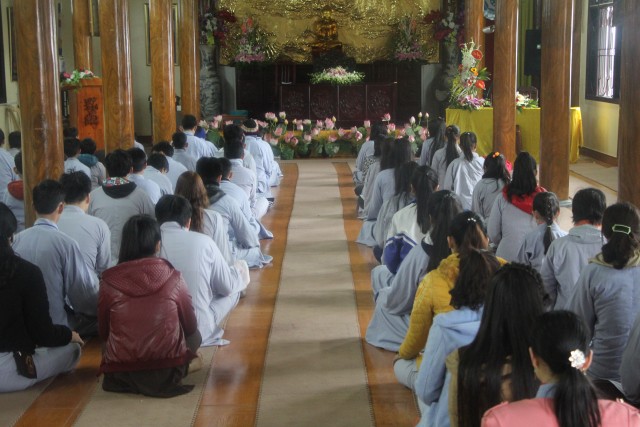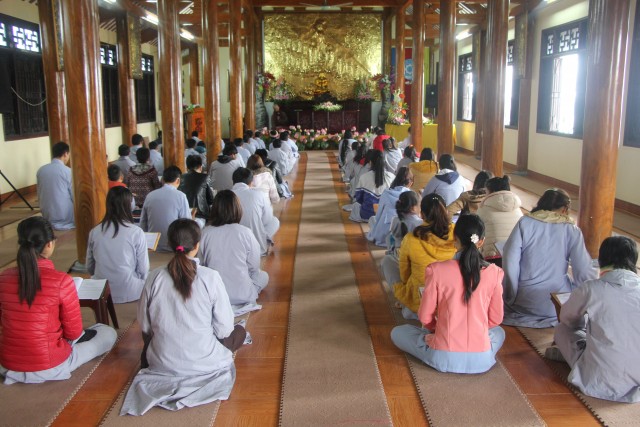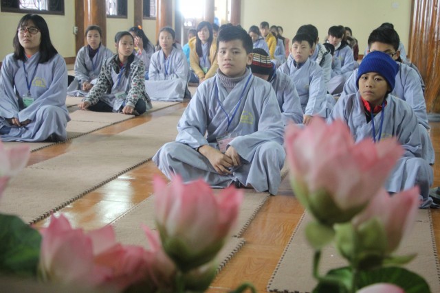 Ngay từ sáng sớm, BTC khóa tu đã bố trí các bàn đăng ký thiện sinh ở trước chính điện. Các bạn đã được BTC tiếp nhận, sắp xếp chỗ gửi đồ, nhận thẻ và áo tràng. Sau đó, các bạn đã nhanh chóng vân tập về giảng đường nghe phổ biến thời khóa tu tập.
