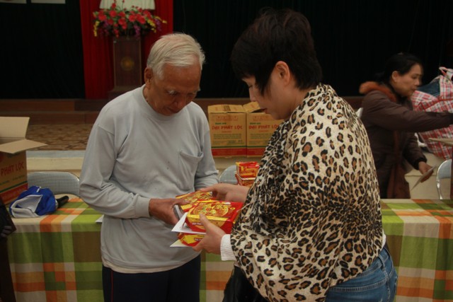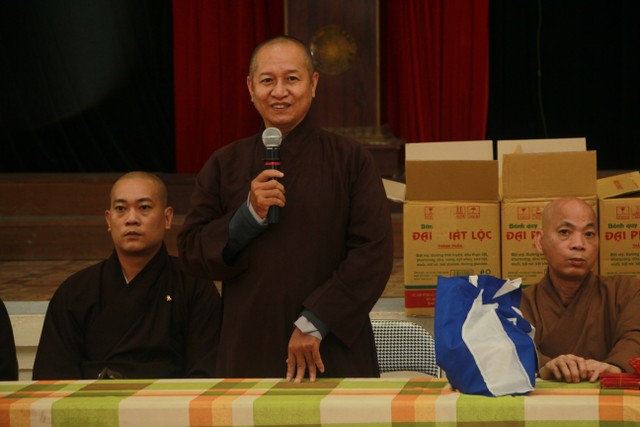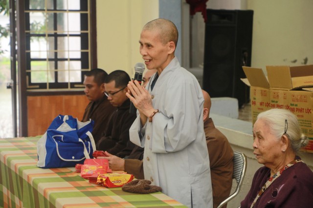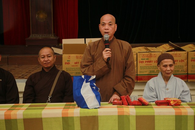 Tại lễ trao quà, chư tôn đức có lời thăm hỏi tới các bác sĩ, nhân viên bệnh viện và tình hình sinh hoạt của các cụ Phật tử. Qúy Thầy động viên các bệnh nhân chuyên niệm Phật để vượt qua tuổi già, bệnh tật, cầu sinh Cực Lạc và có năm mới an khang, hạnh phúc. BS.Nguyễn Thế Bê, Giám đốc bệnh viện thay mặt cho các bệnh nhân có lời cảm ơn công đức quý Thầy cùng các Phật tử đã có lòng hảo tâm, dành một phần tiền dành tặng những mảnh đời kém may mắn. Ông đã báo cáo tình hình sinh hoạt, chữa trị bệnh của các cụ, chúc quý Thầy và Phật tử sang năm mới vô lượng an lạc, vô lượng cát tường.