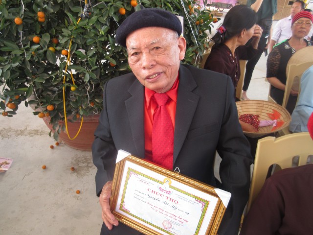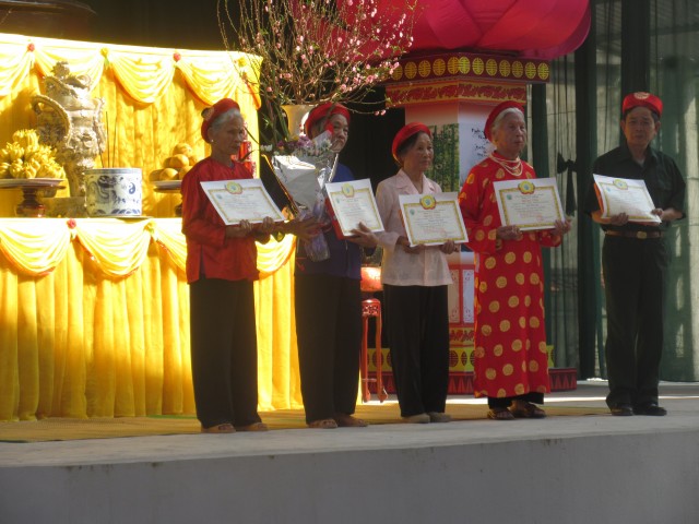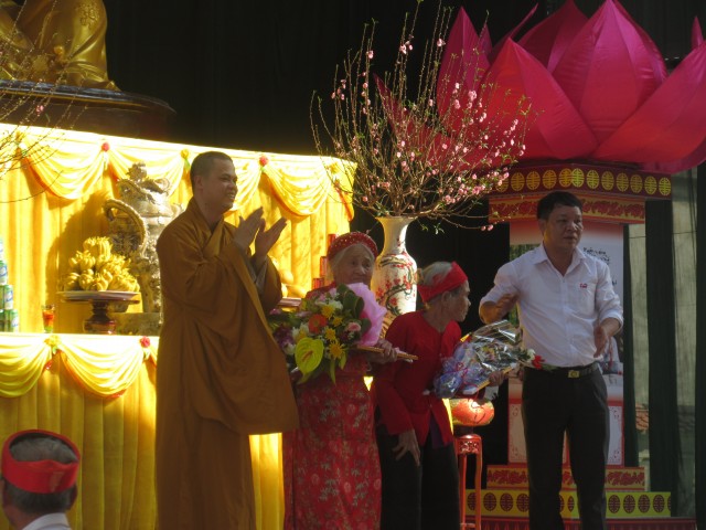 Thầy trụ trì, chính quyền thôn, các đoàn thể cùng con cháu đã trao bằng mừng thọ, chúc thọ, tặng hoa các cụ. Cũng trong buổi lễ, Đại Đức trụ trì đã ban đạo từ nói lên tinh thần hiếu đạo của nhà Phật, qua đó nhắc nhở mọi người phải luôn nhớ ơn và báo ơn đối với cha mẹ, nhất là trong lúc cha mẹ còn đang hiện tiền.