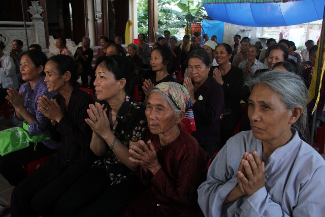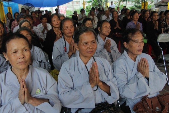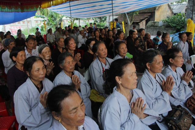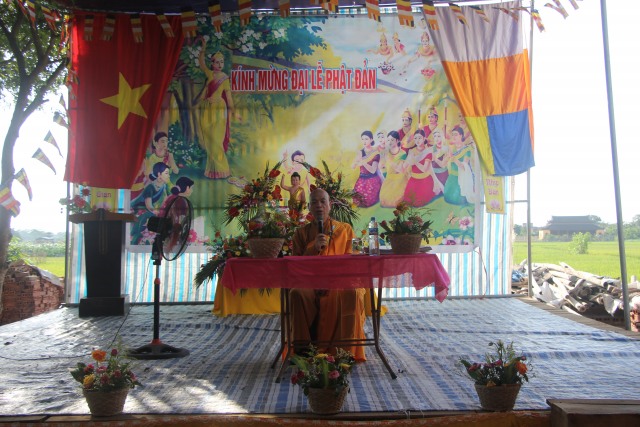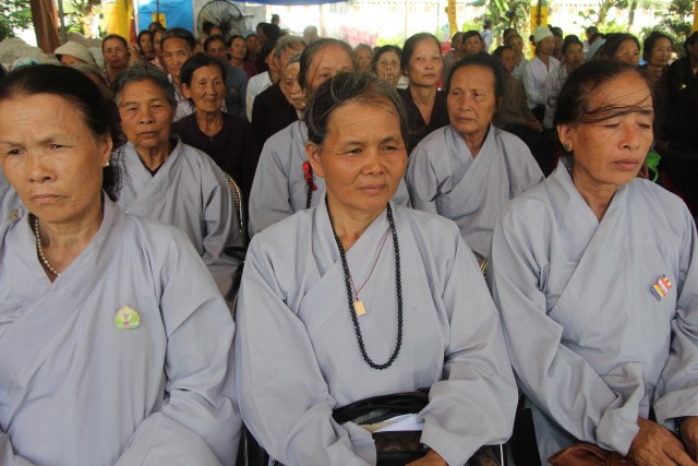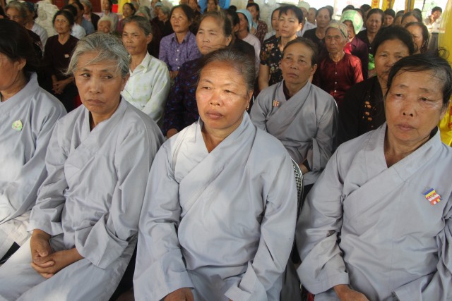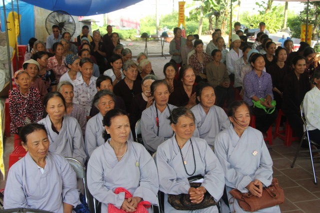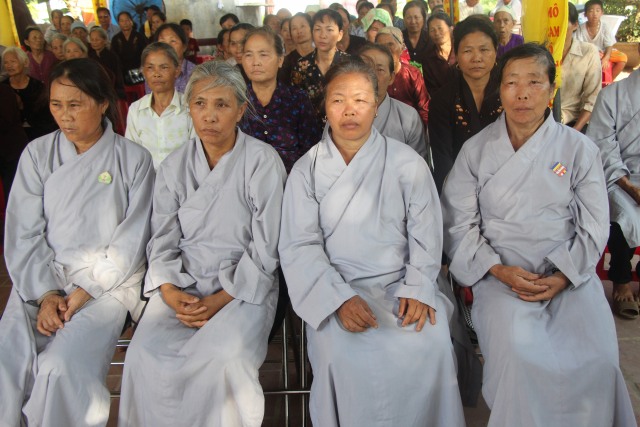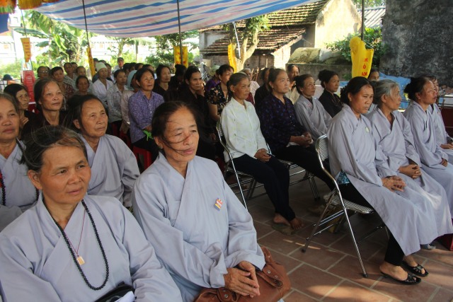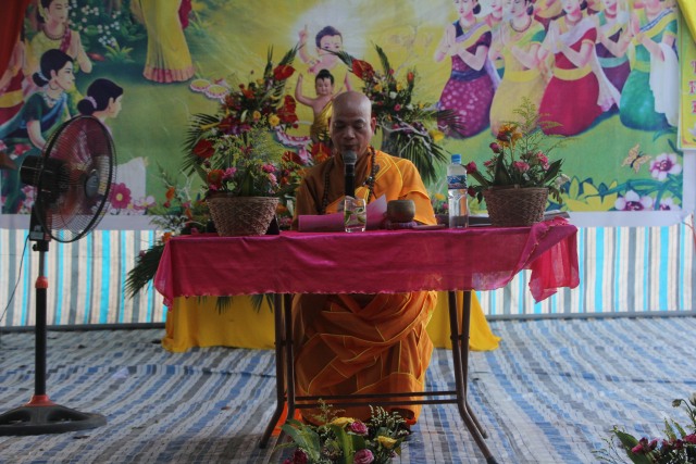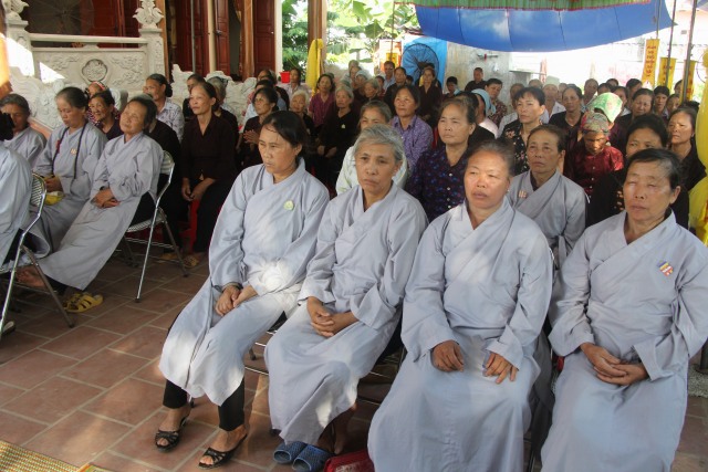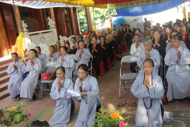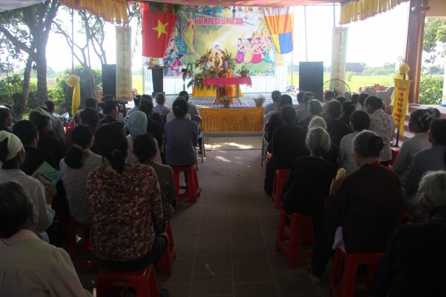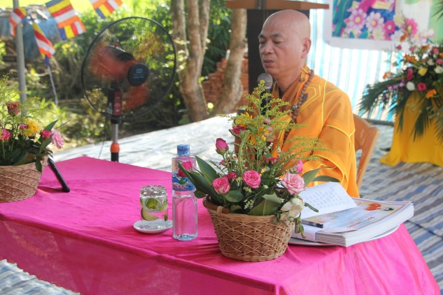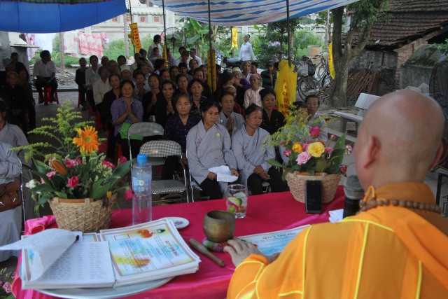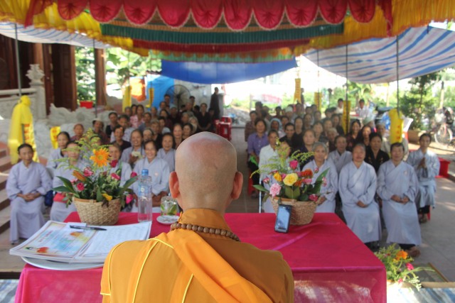Đúng 16h, đại chúng đồng thanh tiếng niệm Phật cung nghinh Thượng tọa giới sư quang lâm giảng đường. Trước khi làm lễ truyền giới, Thượng tọa đã có thời pháp ngắn nói về ý nghĩa của việc quy y Tam Bảo và năm giới của hàng Phật tử tại gia. Thượng tọa chia sẻ: “Đức Phật Thích Ca Mâu ni mặc dù sống trong quyền lực, giàu sang nhưng nhận thấy cảnh khổ ở đời nên đã từ bỏ mọi của của báu trên đời xuất gia học đạo. Ngài luôn suy nghĩ: Con người khi chết đi về đâu? Nhờ sự nỗ lực, quyết tâm Ngài đã thành Phật và ngôi Tam Bảo bắt đầu có từ đó. Thấy được sự quý báu của ba ngôi Phật, Pháp, Tăng, chúng ta cần quay về nương tựa, học và hành theo lời Phật dạy, sửa đổi mọi lỗi lầm. Được vậy, đời sống chúng ta sẽ an lạc, giải thoát”. Sau đó, đại chúng cùng chắp tay nghe Thượng tọa truyền ba quy y và năm giới trong niềm hoan hỷ, tịnh lạc. Cuối buổi lễ, Thượng tọa đã có lời tán thán công đức sư thầy trụ trì đã hết lòng vì đạo pháp, chăm lo đời sống tâm linh cho nhân dân. Thượng tọa cũng có lời sách tấn quý Phật tử ngày đêm tinh tấn, bỏ ác, làm lành, niệm Phật nhằm xây dựng một thế giới hòa bình, an lạc.