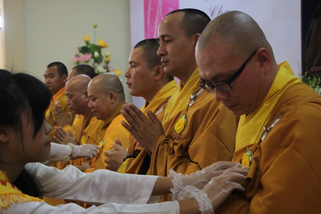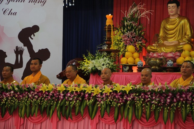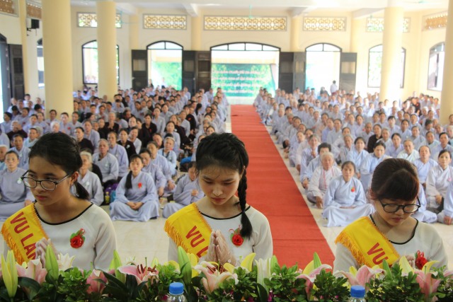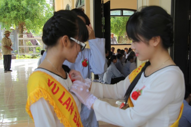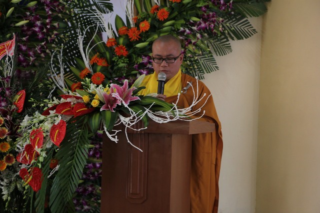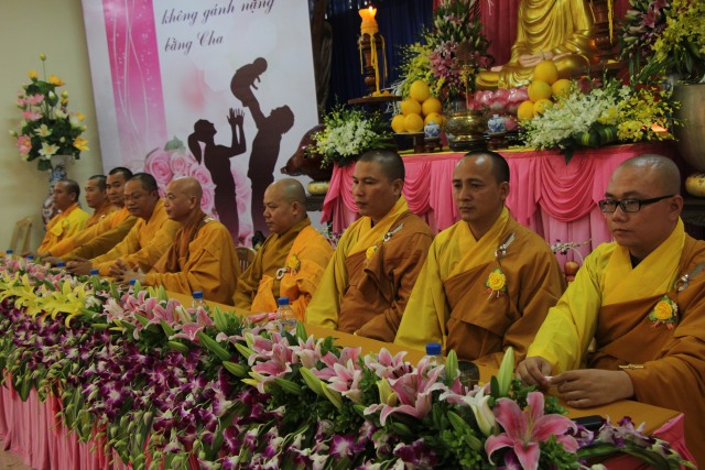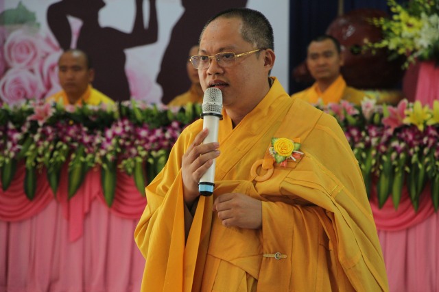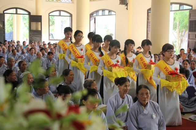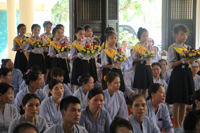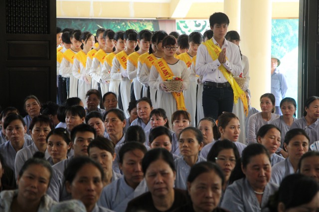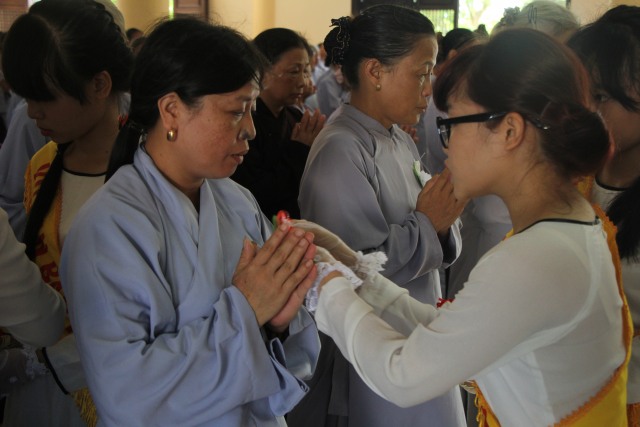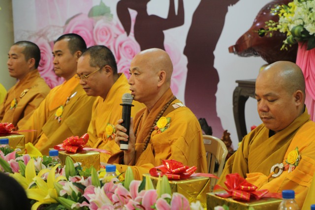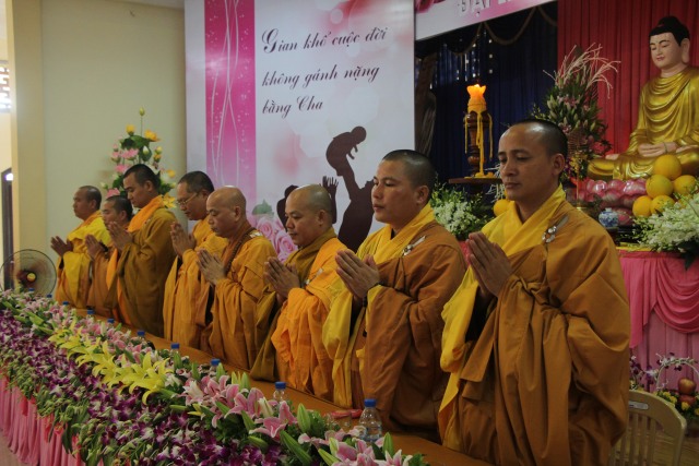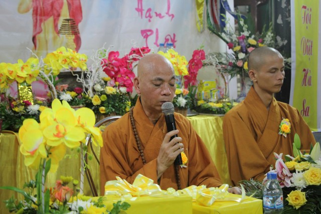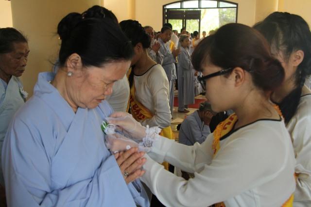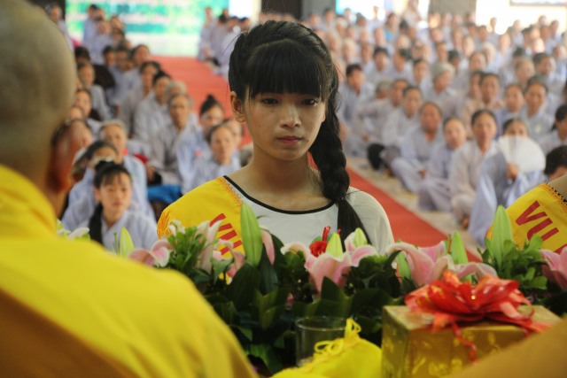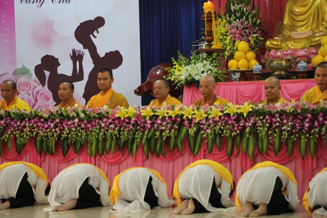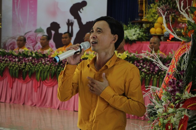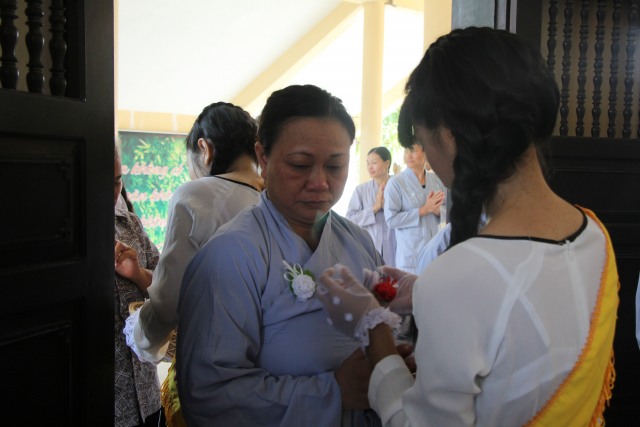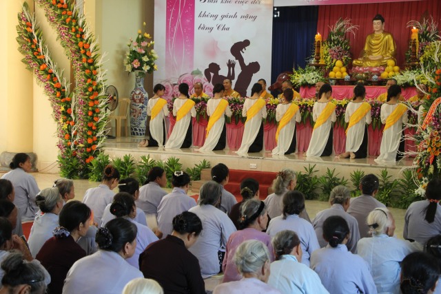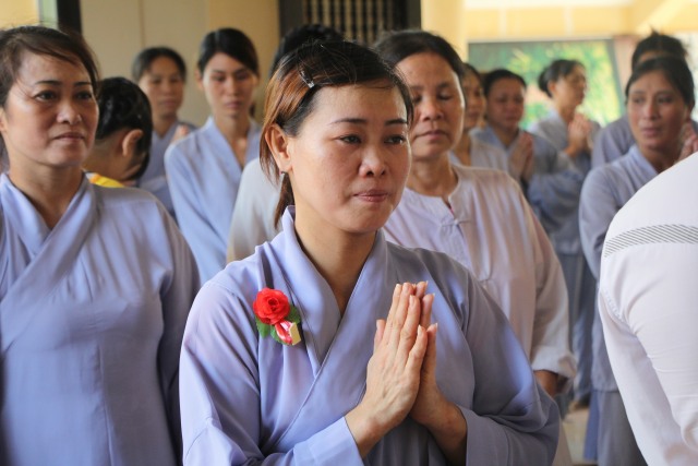 Toàn thể đại chúng vô cùng xúc động khi nghe ĐĐ trụ trì Thích Tâm Kính diễn đọc ý nghĩa cài hoa hồng và hoài niệm về ngày từ biệt cha mẹ đi xuất gia.
