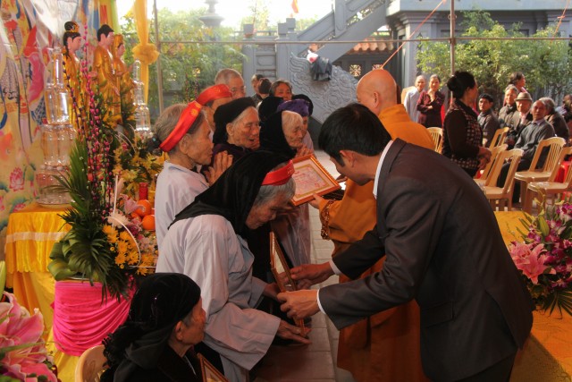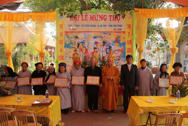 Chư tôn đức, chính quyền thôn, các đoàn thể cùng con cháu đã trao bằng mừng thọ, chúc thọ, tặng hoa các cụ. Cũng trong buổi lễ, Thượng tọa chứng minh đã ban đạo từ nói lên ý nghĩa ngày lễ mừng thọ; tinh thần hiếu đạo của nhà Phật, qua đó nhắc nhở mọi người phải luôn nhớ ơn và báo ơn đối với cha mẹ, nhất là trong lúc cha mẹ còn đang hiện tiền.