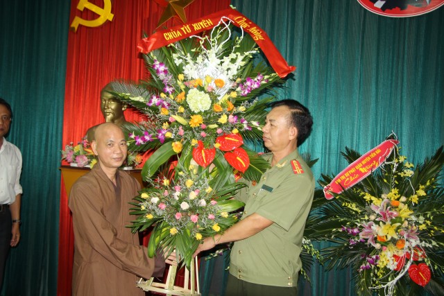 Tiếp đón đoàn, Đại tá Nghiêm Lương Duyên, Trưởng phòng An ninh xã hội (PA88) Công an tỉnh đã thay mặt Ban giám đốc và cán bộ chiến sĩ Công an tỉnh cảm ơn chư Tăng, Phật tử bản tự tỉnh đến thăm và chúc mừng nhân dịp 70 ngày truyền thống lực lượng Công an nhân dân. Ông cảm ơn sự quan tâm của chư Tăng, Phật tử chùa Từ Xuyên đối với lực lượng Công an, đánh giá cao các hoạt động Phật sự ích đạo, lợi đời của nhà chùa, công tác giữ gìn an ninh trật tự xã hội, đặc biệt là các khóa tu mùa hè dành cho thanh, thiếu niên. Ông cũng khẳng định Công an tỉnh sẽ hỗ trợ hết mình cho PG tỉnh trong các dịp đại lễ và chúc Chư Tôn giáo phẩm, Tăng Ni Phật tử tỉnh mạnh khỏe để phụng đạo, giúp đời.
