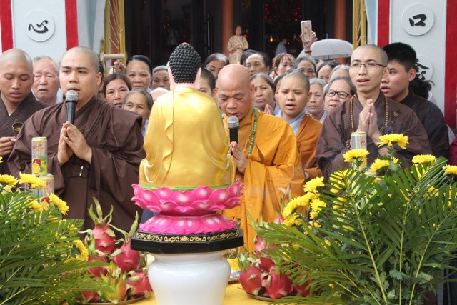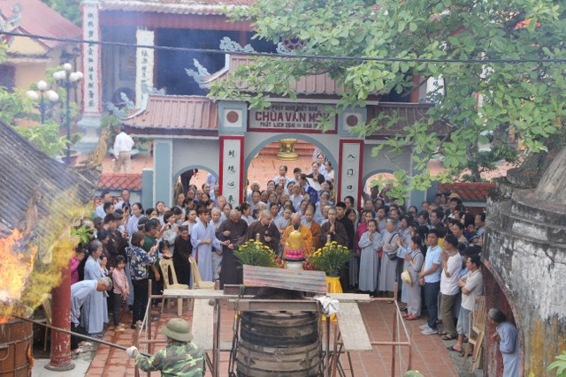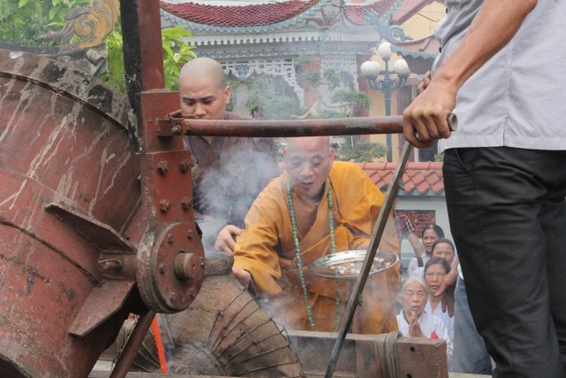 Đúng 09 giờ 30 chư tôn đức cử hành nghi thức niêm hương, sái tịnh cầu nguyện lễ rót đồng đúc tượng được thành tựu viên mãn.