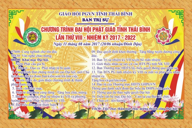 Sau một thời gian chuẩn bị, hôm nay, ngày 10/08/2017, mọi công tác Đại hội Đại biểu lần thứ VIII, đã đi vào hoàn thiện. Các tiểu Ban: Khánh tiết, Ẩm thực, Văn hóa, Thị giả, Lễ tân, Thông tin – Truyền thông, Dẫn thỉnh… đã ổn định và sẵn sàng để cung nghinh chư Tôn đức chứng minh, chào đón các cấp chính quyền cùng quý Đại biểu quan khách quang lâm tham dự Đại hội. Trước đó, ngày 07/08, BTS GHPGVN tỉnh Thái Bình đã họp tổng kết mọi công tác chuẩn bị cùng Trưởng các Tiểu ban. Phân công và phân nhiệm lần cuối chuẩn bị cho công tác Đại hội diễn ra một cách trang nghiêm, thanh tịnh.