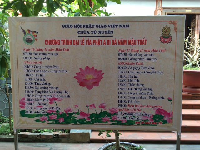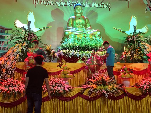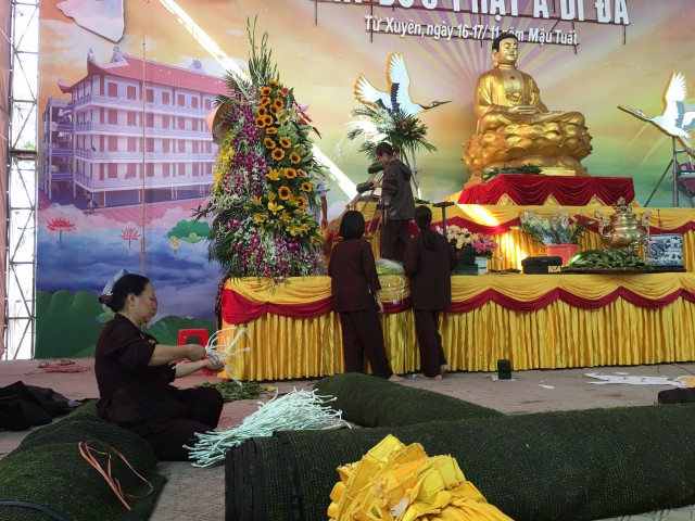 Chính vì lẽ đó, trong hai ngày 16 – 17/11/Mậu Tuất (tức ngày 22 – 23/12/2018), chùa Từ Xuyên (P.Hoàng Diệu, TP.Thái Bình), sẽ tổ chức khóa tu niệm Phật và lễ hội hoa đăng mừng kỷ niệm đức Phật A Di Đà, cúng dường lên đức Từ phụ, sau cũng nhờ ân đức này nguyện cầu đức Phật A Di Đà và chư thánh chúng từ bi gia hộ cho Phật pháp trường tồn, Tăng – già hưng thịnh, thế giới hòa bình, quốc thái dân an, chúng sinh được thấm nhuần Phật pháp, người người biết yêu thương nhau, hiện thời an lạc, ngày sau được sinh về nơi liên hoa chín phẩm. Chư Tăng và Phật tử bản tự đang gấp rút hoàn thiện lễ đài sân khấu, chuẩn bị cho hai ngày tu tập và đêm hội hoa đăng.
