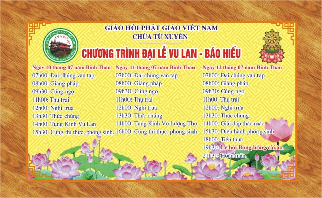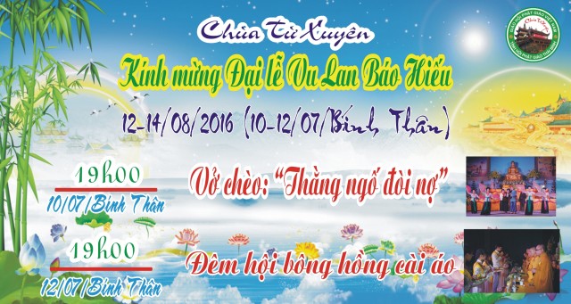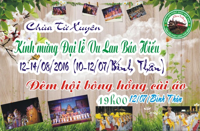 Cũng trong tháng Bảy chùa Từ Xuyên long trọng tổ chức đại lễ Vu Lan báo hiếu vào trong ba ngày: từ 12 – 14/08/2016 (nhằm 10 – 12/07/Bính Thân). Đại lễ không ngoài mục đích hướng mọi người sống trong tinh thần hiếu hạnh của người con Phật, noi theo gương hiếu của Ngài Mục Kiền Liên nhằm đền trả phần nào công ơn của Tam Bảo, ông bà, cha mẹ trong muôn một, hồi hướng phúc lành trong mùa Báo hiếu năm nay.