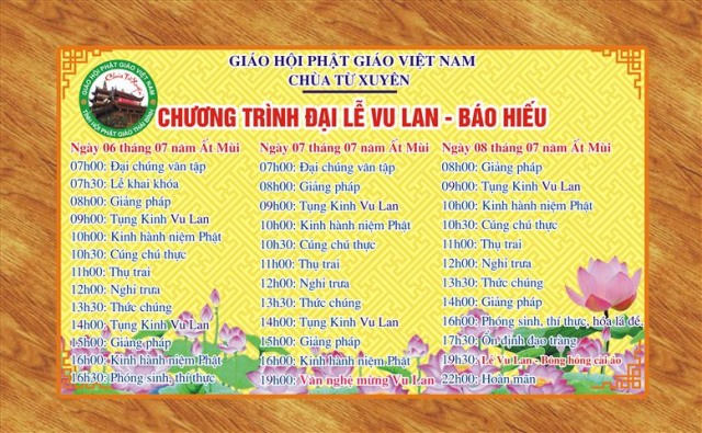 Cũng trong tháng Bảy chùa Từ Xuyên long trọng tổ chức đại lễ Vu Lan báo hiếu vào trong ba ngày: từ 19 – 21/08/2013 (nhằm 06 – 08/07/Ất Mùi).