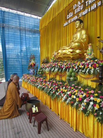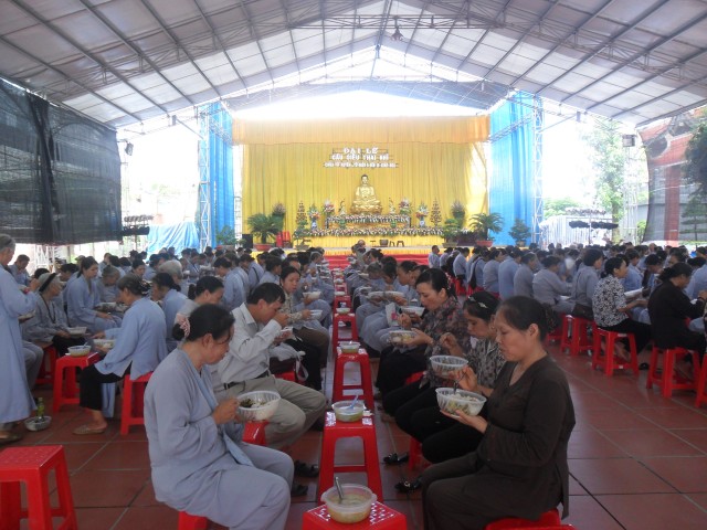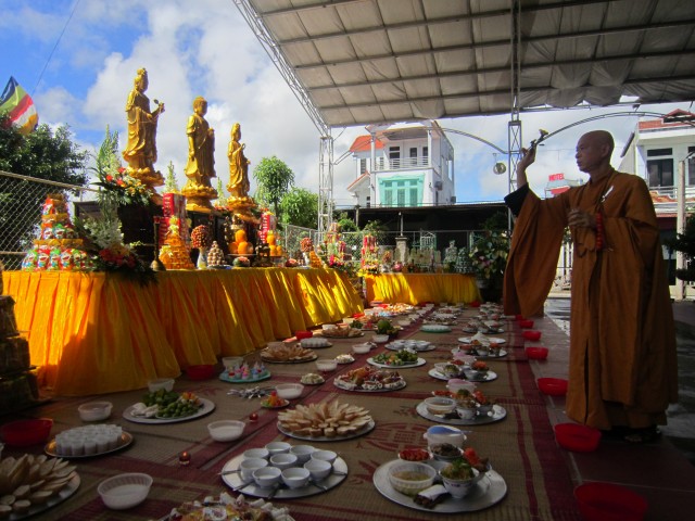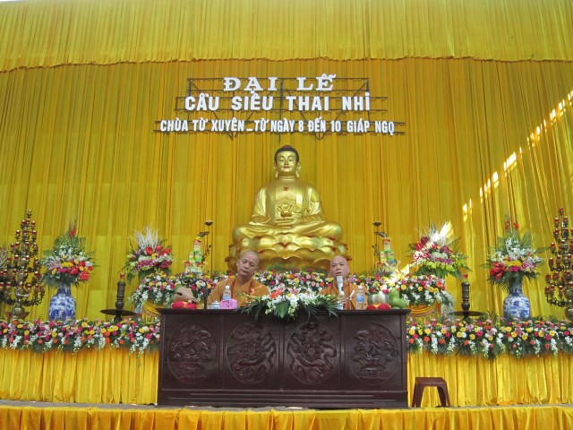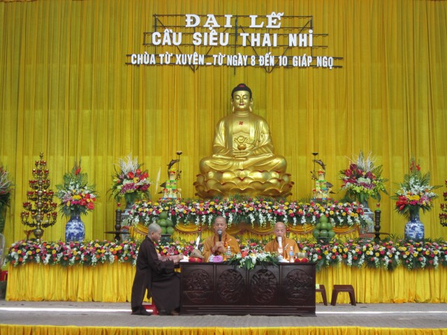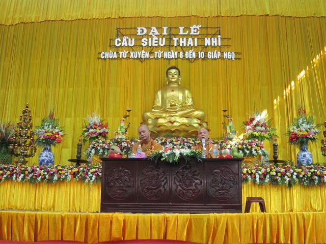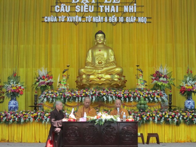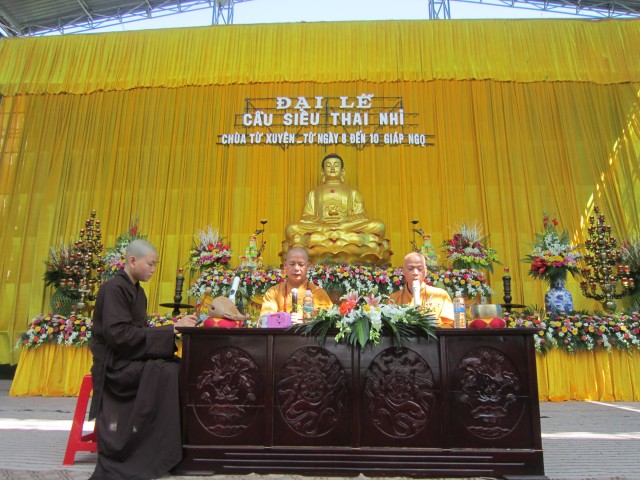 Bài pháp TT trụ trì giảng nói về “Nhân quả của tội phá thai”. Trong lời pháp, TT nhấn mạnh: Vì những quan niệm sai lầm mà không ít bậc cha mẹ đã lỡ bỏ đi những đứa con của mình. Có những người do nạo, phá thai quá nhiều lần nên vong linh các hài nhi bám theo, gây ra sự bất an và bệnh tật cho người mẹ. TT cũng nhắc nhở chỉ có chí thành sám hối, niệm Phật cầu siêu, dứt trừ nghiệp sát mới có thể giải được oan gia trái chủ, thân tâm an lạc. Sau thời pháp thoại, đại chúng bước vào đệ nhất thời hệ niệm. Kết thúc thời khóa buổi sáng, chúng hội đã cử hành lễ cúng ngọ, cúng chư vong linh. Đại lễ sẽ hoàn mãn vào tối 10/8/Giáp Ngọ với đêm thắp nến cầu siêu.