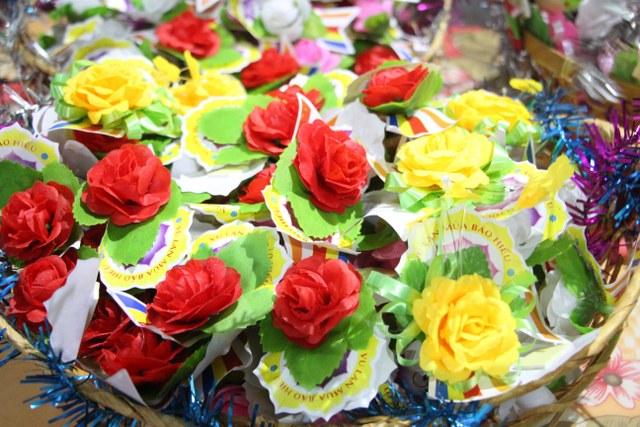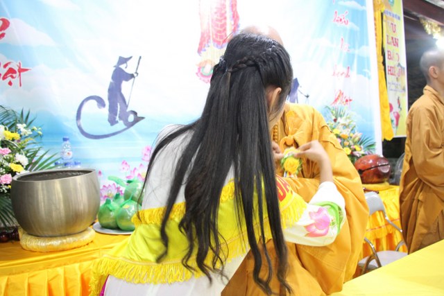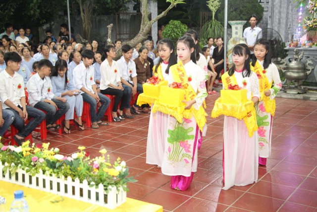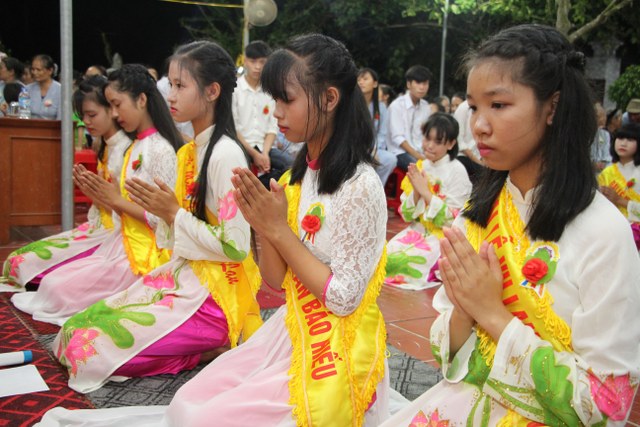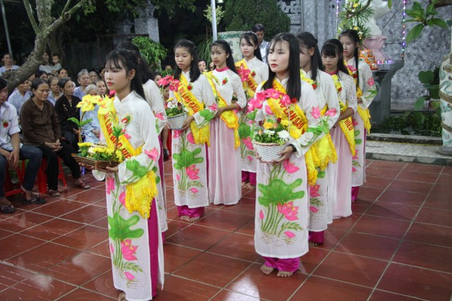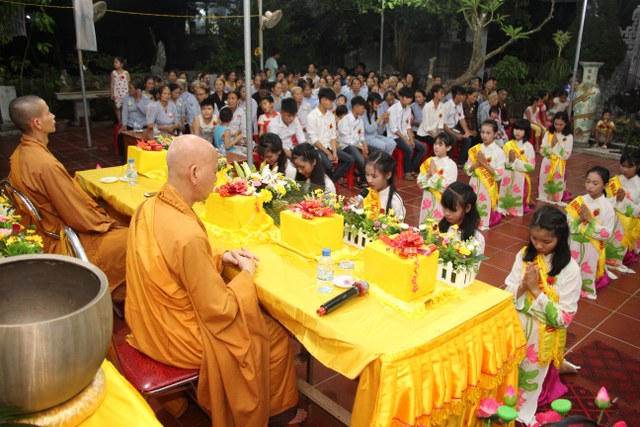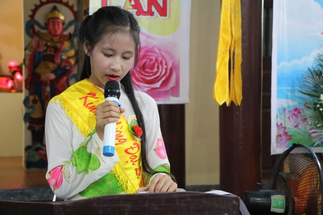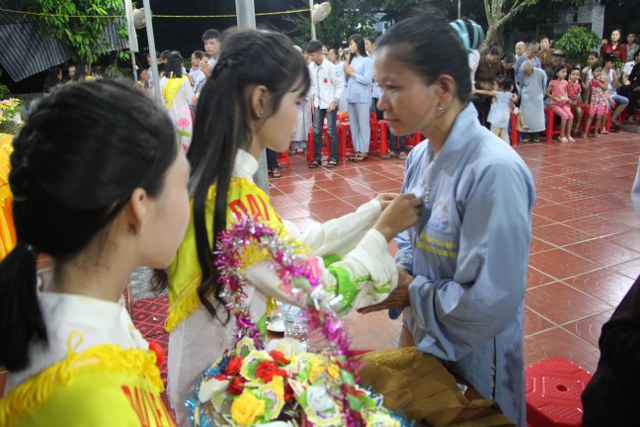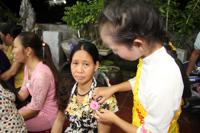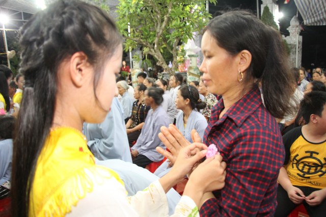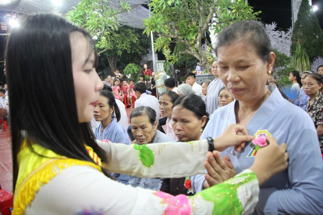 Toàn thể đại chúng vô cùng xúc động khi nghe bạn Ngọc Anh diễn đọc ý nghĩa cài hoa hồng và hoài niệm về những ngày thơ bé bên cha mẹ. Sau đó, các bạn trẻ đã cài hoa hồng kính dâng chư tôn đức, tặng quý vị khách quý cùng nhân dân Phật tử trong niềm cảm thương dâng trào về người cha, người mẹ khả kính.