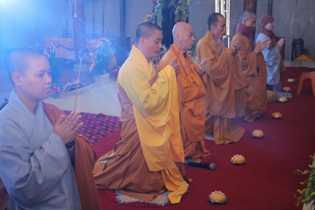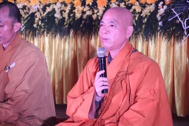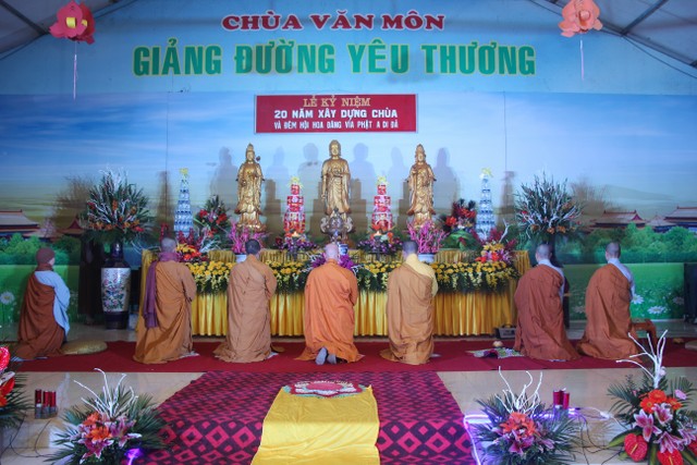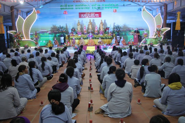 Trong không khí se lạnh của miền Bắc hòa quyện với những ánh sáng tỏa khắp khuôn viên chùa Văn Môn, toàn thể hội chúng được lắng nghe lời đạo từ của Thượng tọa chứng minh. Trong lời đạo từ, Thượng tọa đã tán thán công đức của quý thiện nam tín nữ xa gần đã về chùa trong những ngày qua, cùng sự phát tâm công đức của quý Phật tử để Đại lễ trang nghiêm, thanh tịnh. Qúy Thầy có lời sách tấn đại chúng: “Đức Phật Thích Ca suốt 49 năm thuyết pháp vì muốn đưa chúng sinh thoát vòng sinh tử luân hồi nên đã chỉ ra muôn vàn pháp môn tu tập như vị lương y xem bệnh cho thuốc. Ngài nhận thấy trong đời mạt pháp, pháp môn niệm Phật là pháp môn khế hợp căn cơ chúng sinh, dễ tu, dễ chứng. Chúng ta muốn thành tựu pháp môn này cần đầy đủ tín, hạnh và nguyện. Tức là tin là có đức Phật A Di Đà, trì niệm danh hiệu của Ngài và phát nguyện được sinh về cảnh giới Cực Lạc. Do đó, quý Phật tử cần tin sâu và thực hành lời Phật dạy, nương theo câu niệm Phật, trau dồi giới hạnh để hiện đời, ngày sau sinh về Lạc cảnh”.
