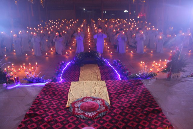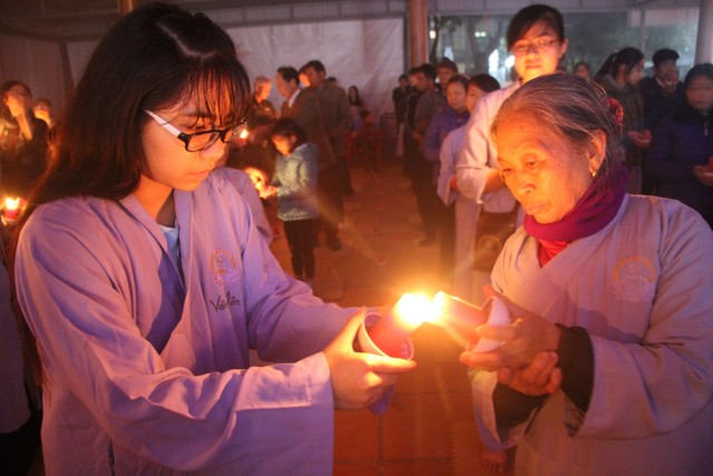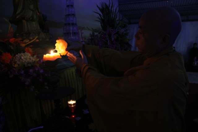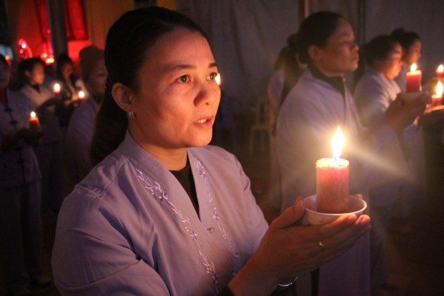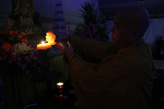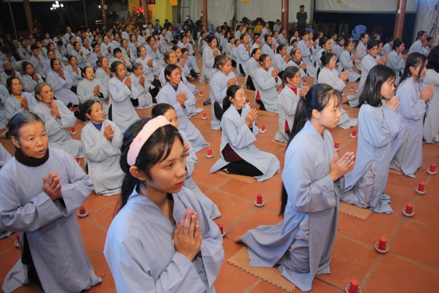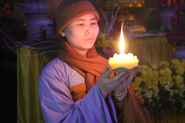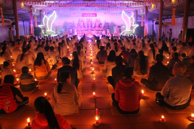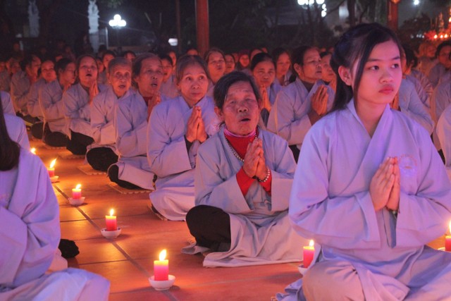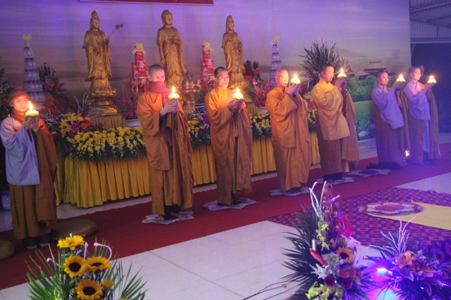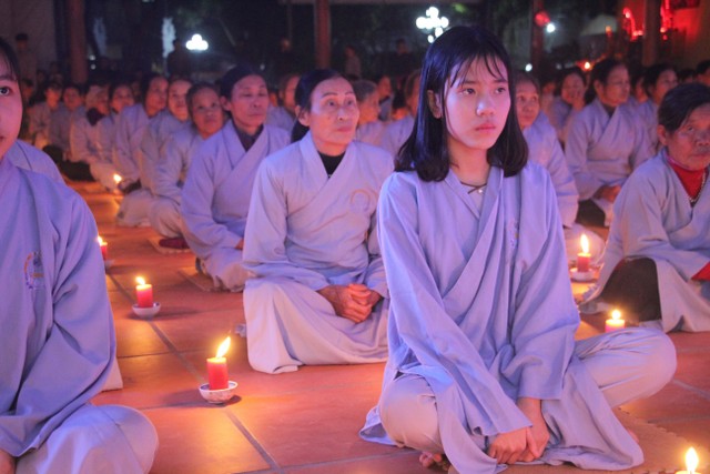 Đúng 19g00, dưới sự chứng minh thanh tịnh của chư tôn Thượng tọa, Đại đức Tăng, Ni và sự hiện diện rất mực trang nghiêm, thành tín của quý Phật tử, đại chúng đã lắng lòng thanh tịnh niêm hương bạch Phật, xưng tán hồng danh đức Từ phụ A Di Đà, đọc 12 lời phát nguyện niệm Phật cầu nguyện cho đêm hội được thập phần viên mãn.