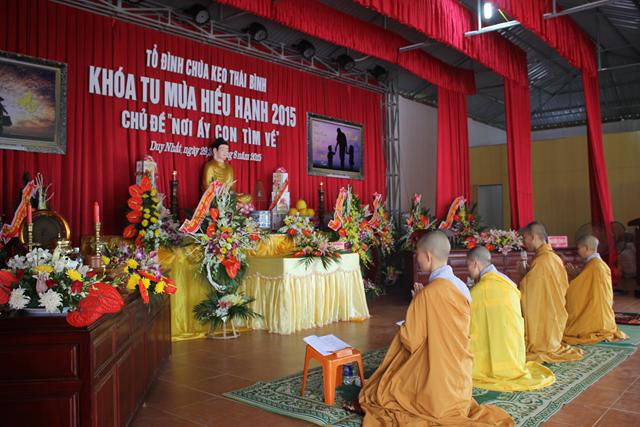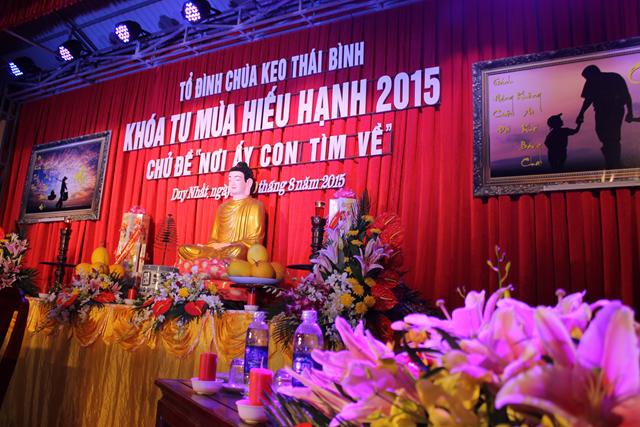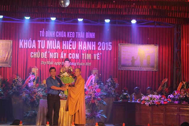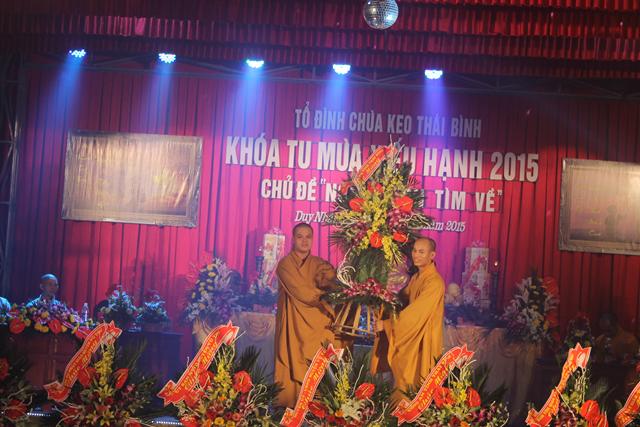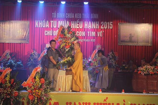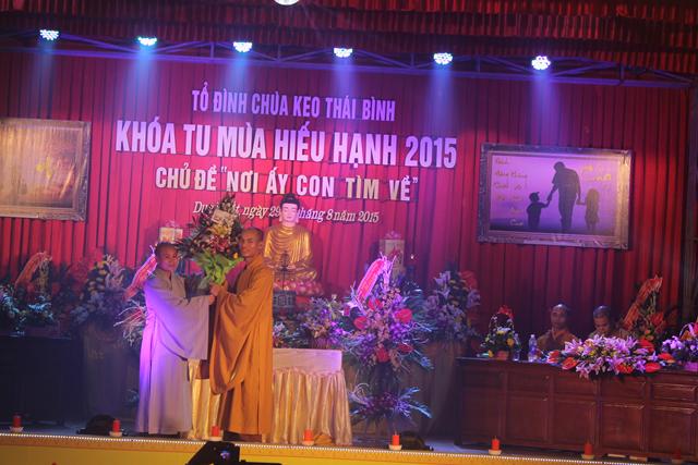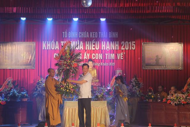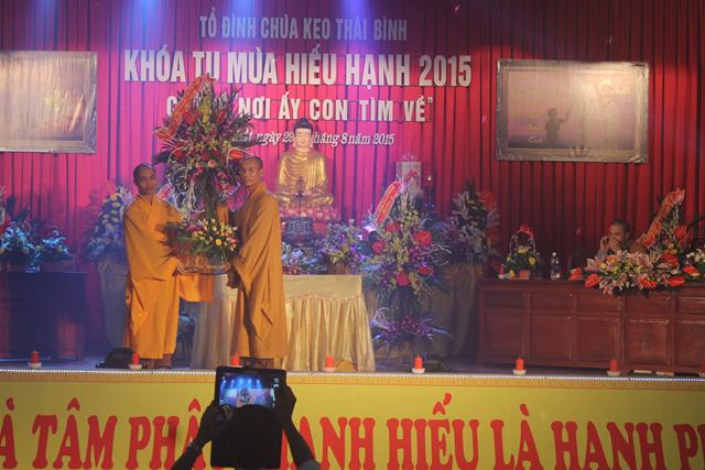 Nhân dịp này, Chư tôn đức trong chốn trụ xứ tổ đình chùa Keo đã đón nhận những lẵng hoa tươi thắm chúc mừng Vu Lan, cũng như chúc cho khóa tu “ Nơi ấy con tìm về” được thành tựu viên mãn từ phía GHPGVN tỉnh Thái Bình, ban trị sự GHPGVN huyện Vũ Thư và các cấp lãnh đạo chính quyền tỉnh cũng như chính quyền huyện Vũ Thư.