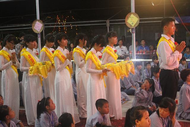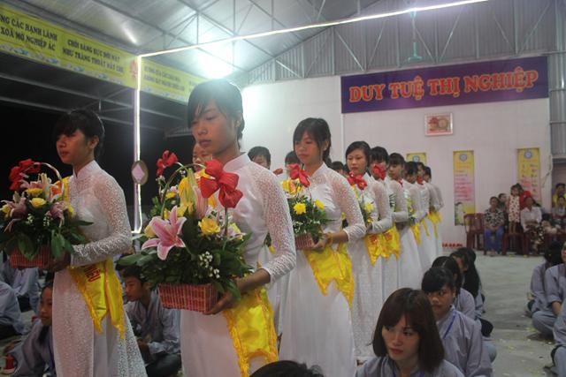 Trước khi chính thức vào buổi lễ thắp nến tri ân cha mẹ, ông bà, tổ tiên nhân mùa vu lan, đại diện các em khóa sinh tham dự khóa tu đã bằng tấm lòng thành kính của mình dâng những đóa hoa tươi thắm, những phẩm vật cúng dường lên chư tôn đức Tăng Ni nhân mùa vu lan PL.2559 – DL. 2015.