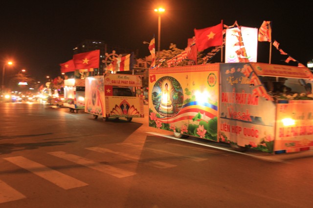Đúng 18 giờ, xe hoa các đơn vị trong thành phố và các huyện tập kết dọc đường Hai Bà Trưng, trước cổng trung tâm Hội nghị tỉnh theo thứ tự sơ đồ đã định. Sau khi ổn định đội hình, đúng 20 giờ gần 50 chiếc xe hoa và xe máy, xe đạp gắn cờ Phật giáo bắt đầu chuyển bánh diễu hành. Theo đó, dẫn đầu là xe Phật, tiếp đến là các xe chuông, trống và thứ tự xe hoa của các ban Trị sự, các chùa tham gia triết trí theo chủ đề liên quan đến cuộc đời Đức Phật từ Đản sinh đến Niết-bàn để cúng dường.