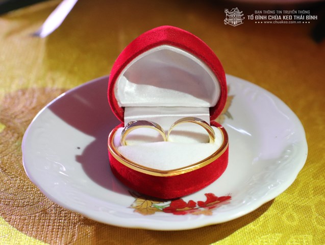 Trước khi đôi bạn trẻ trao nhẫn cho nhau, đại đức Thích Thanh Quang đã làm lễ sái tịnh, chú nguyện vào đôi nhẫn cưới và giảng cho đôi tân lang – tân nương hiểu về ý nghĩa của chiếc nhẫn cũng như vai trò của chữ “Nhẫn” trong hạnh phúc gia đình. “ Nhẫn” ở đây chính là sự nhẫn nhịn, sự nhường nhịn lẫn nhau.
