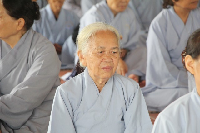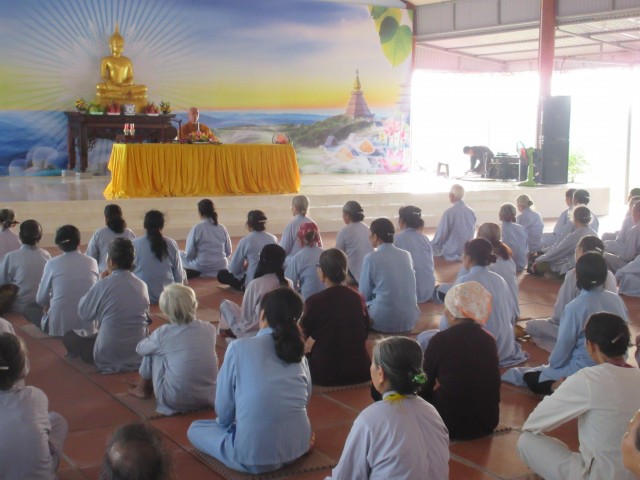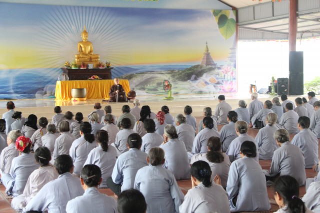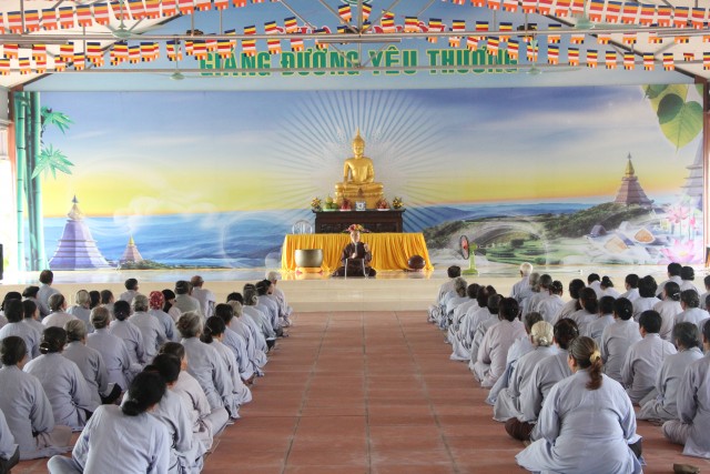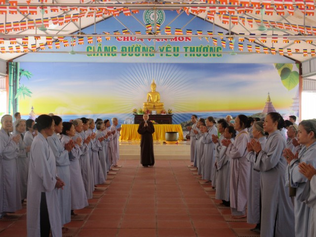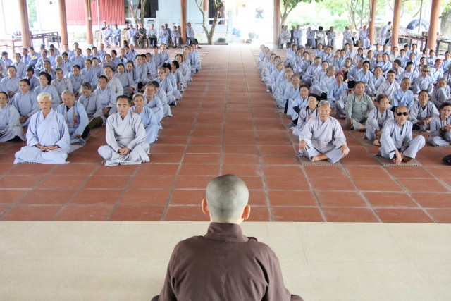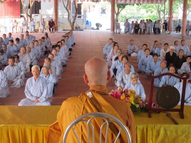 Sau thời tụng kinh chiều, Thượng tọa trụ trì Thích Thanh Định quang lâm đạo tràng hướng dẫn quý Phật tử tụng giới, bố tát. Với hàng Phật tử, dù xuất gia hay tại gia, sau mỗi nửa tháng lại tụ họp lại để đọc tụng giới luật đã thụ, kiểm điểm lại bản thân và phát lồ sám hối với đại chúng, qua đó thanh tịnh thân tâm, thành tựu Phật đạo. Thượng tọa nhắc nhở mọi người cùng giữ gìn giới luật, đạo đức nguyện trọn đời quy y Tam Bảo. Cuối bài pháp Thượng tọa cũng mong muốn tất cả các liên hữu đồng tu tại đạo tràng luôn luôn nương tựa vào ngôi Tam Bảo, tin sâu, hành trì pháp môn niệm Phật và luôn đi theo con đường chính pháp. Khóa tu khép lại trong niềm hoan hỷ của đại chúng sau nghi thức tụng ngũ giới, Bồ tát giới của quý Phật tử