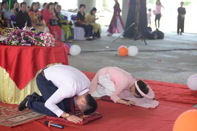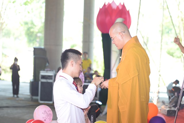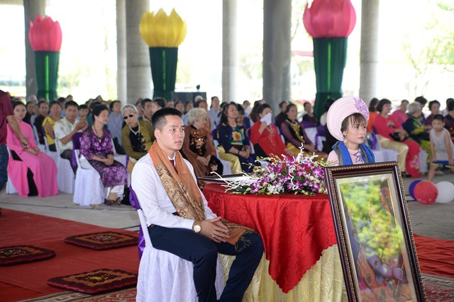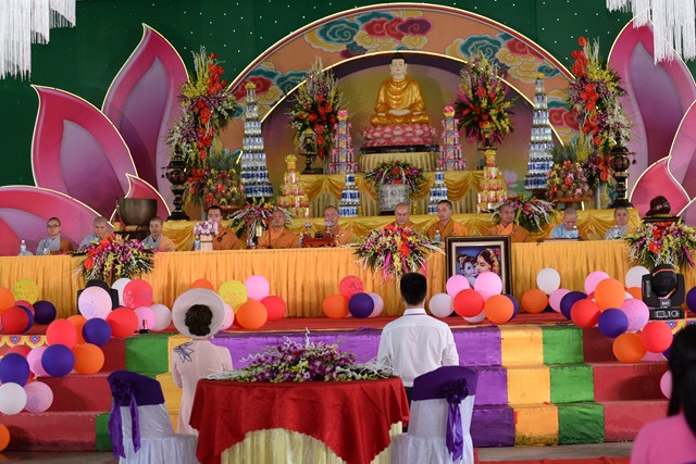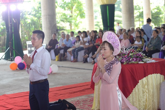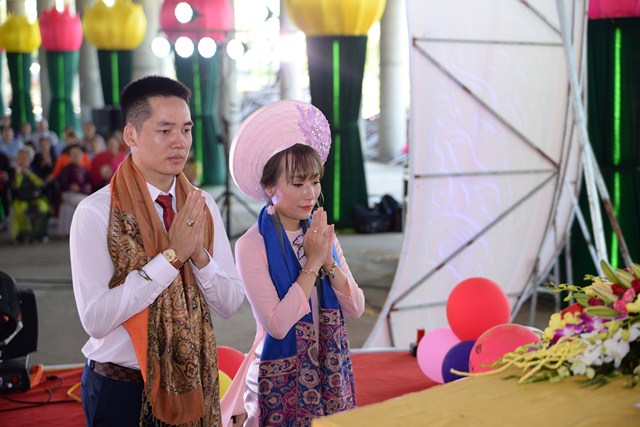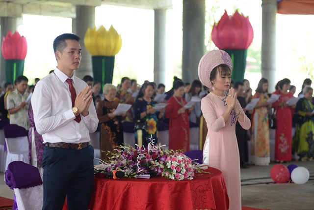 Trước khi kết thúc buổi lễ, Chư tôn đức Tăng ni, đôi tân lang, tân nương, gia đình nội ngoại 2 bên cùng toàn thể đại chúng đã cử hành nghi lễ niêm hương bạch Phật, tụng kinh 7 loại vợ để cầu nguyện cho đôi bạn trẻ luôn được sống trong ánh hào quang của mười phương chư Phật, sống một cuộc sống an lạc và hạnh phúc.