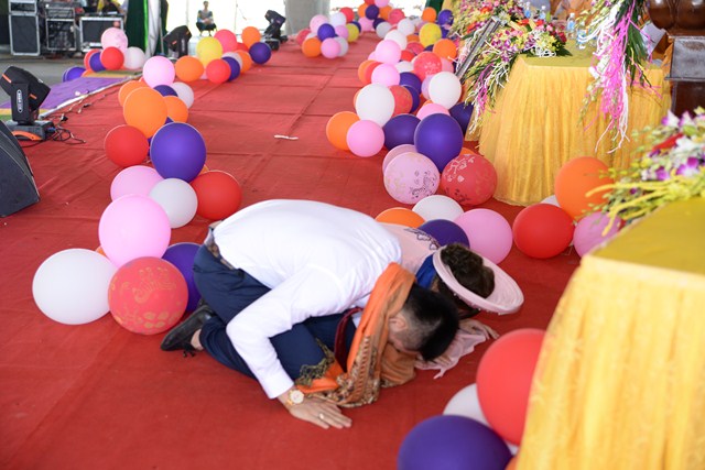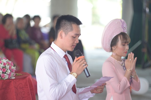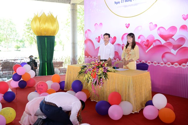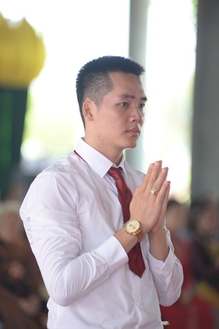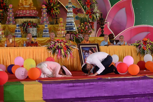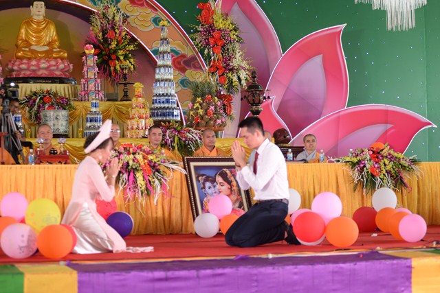 Dưới ánh từ quang của mười phương Chư Phật và sự hiện diện chứng minh của Chư tôn đức tăng ni hiện tiền, đôi bạn trẻ đã làm lễ tạ ơn Tam Bảo, lễ tứ trọng ân đầy xúc động để tri ân Tam Bảo, tri ân công sinh thành dưỡng dục của hai đấng song thân. Đồng thời, để thể hiện sự kính trọng, tôn kính lẫn nhau, đôi bạn trẻ đã lễ lạy nhau thông qua nghi lễ “ Bình Đẳng” dưới sự chứng minh của chư tôn đức tăng ni và hai bên gia đình.