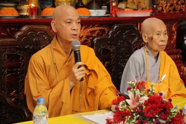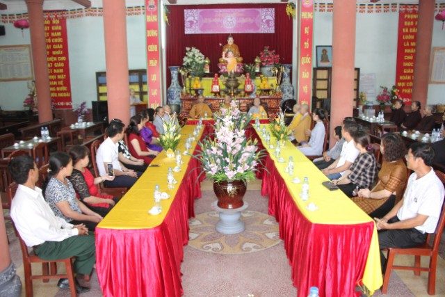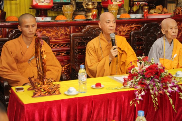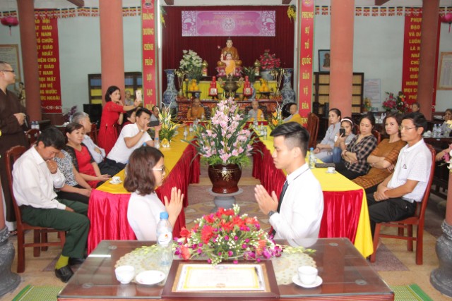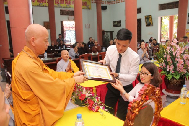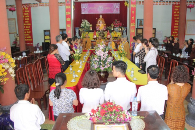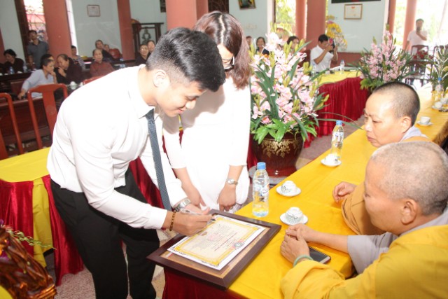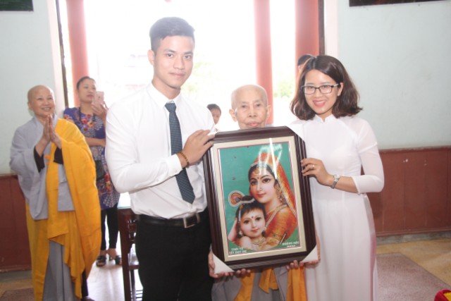 Trong niềm hoan hỷ của buổi lễ, Thượng tọa chứng minh đã chia sẻ về lời Phật dạy trong kinh Bảy loại vợ. Từ đó đôi bạn trẻ đã nhận thức rõ trách nhiệm, bổn phận trong đời sống hôn nhân. Mỗi người phải như một người mẹ, người cha, người bạn, người em, người hầu với người bạn đời. Thượng tọa cũng không quên khuyến tấn tân lang, tân nương phải sống trọn vẹn bổn phận làm vợ và làm chồng, làm dâu hiền, rể thảo cùng xây dựng hạnh phúc gia đình theo tinh thần kinh Thiện Sinh. Tiếp đó, đôi bạn đã đối trước Tam Bảo đọc lời thệ nguyện yêu thương nhau trọn đời và hộ trì chính pháp; đỉnh lễ công ơn sinh thành, dưỡng dục của song thân; đỉnh lễ tôn trọng sự bình đẳng của nhau. Sau đó, đích thân NT.Thích Đàm Lưu, Chứng minh Phân ban Ni giới tỉnh thay mặt chư tôn đức Tăng Ni trao nhẫn và trao quà cưới cho hai bạn.
