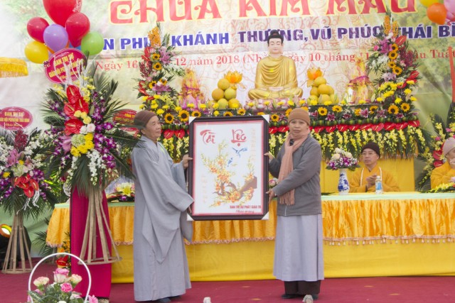 TT.Thích Trí Sử, UVTT BTS PG tỉnh, Trưởng BTS PG TP.Thái Bình thay mặt cho chư Tăng chứng minh, đã có lời đạo từ với toàn thể đại chúng. Thượng tọa nhấn mạnh ý nghĩa tâm linh, văn hóa của ngôi chùa trong đời sống Việt Nam, là nơi sinh hoạt tôn giáo và là di sản văn hóa của dân tộc. Thượng tọa tán thán công đức Ni sư trụ trì chùa Kim Mâu đã có nhiều Phật sự hoằng ích đạo lợi đời, hoằng dương Phật pháp. Thượng tọa cũng không quên tán thán công đức và khuyến tấn quý Phật tử đã phát tâm để có ngôi Tam Bảo huy hoàng như ngày hôm nay. Kết thúc buổi lễ, chư tôn đức và quý quan khách đã ra trước cổng tam quan cắt băng khánh thành, thả bóng bay và chim bồ câu hòa bình, niêm hương cầu nguyện tại chính điện.