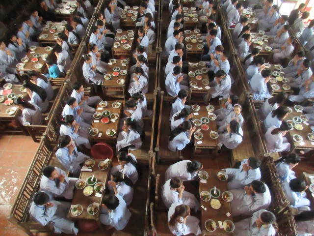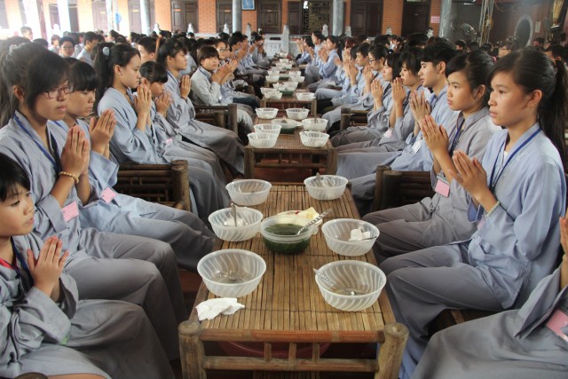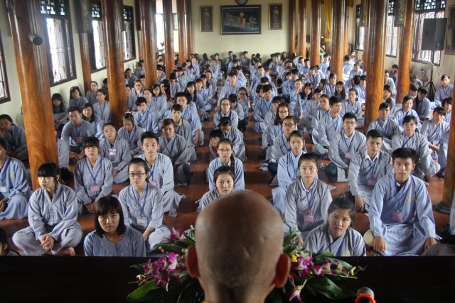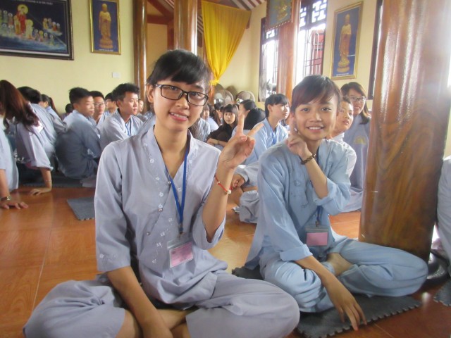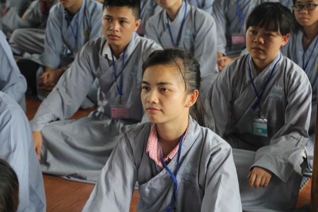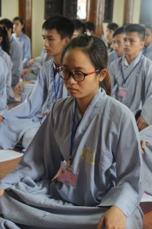Ngay từ sáng sớm, BTC khóa tu đã bố trí các bàn đăng ký thiện sinh ở trước chính điện. Các bạn đã được BTC tiếp nhận, sắp xếp chỗ gửi đồ, nhận thẻ và áo tràng. Sau đó, các bạn đã nhanh chóng vân tập về giảng đường tầng 4 nghe phổ biến thời khóa tu tập.