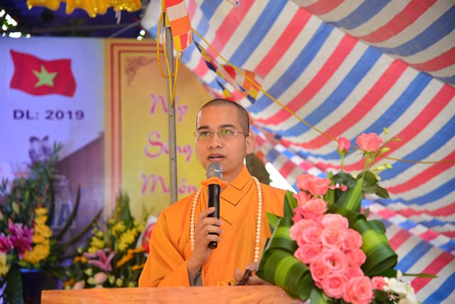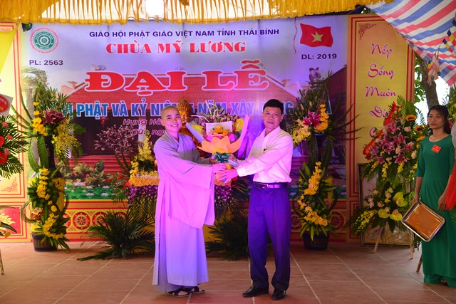 Sư thầy Thích Diệu Minh đón nhận lẵng hoa chúc mừng của đai diện chính quyền địa phương
