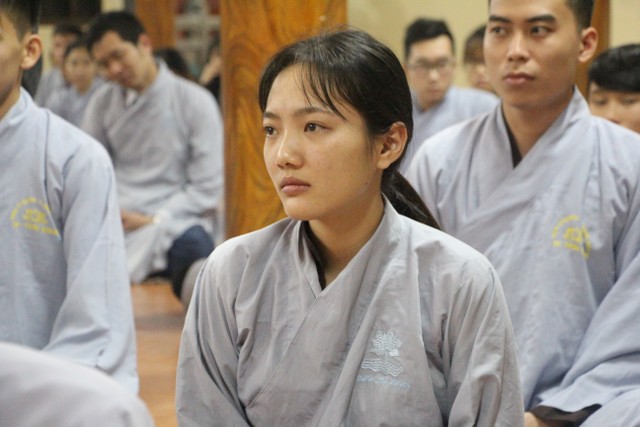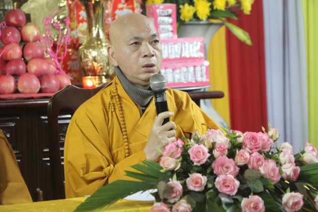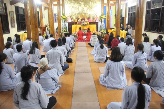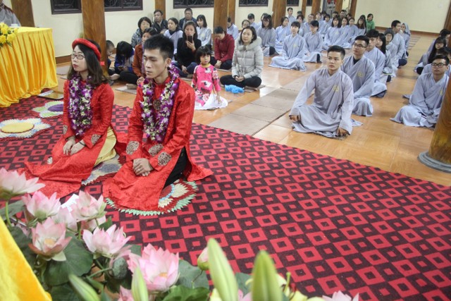 Tiếp đó, đôi bạn đã đối trước Tam Bảo đọc lời thệ nguyện yêu thương nhau trọn đời và hộ trì chính pháp; đỉnh lễ công ơn sinh thành, dưỡng dục của song thân; đỉnh lễ tôn trọng sự bình đẳng của nhau. Sau đó, đích thân Thượng tọa trao nhẫn và trao quà cưới cho hai bạn. Trong niềm hoan hỷ của buổi lễ, quý Thầy đã khuyến tấn tân lang, tân nương phải sống trọn vẹn bổn phận làm vợ và làm chồng, làm dâu hiền, rể thảo cùng xây dựng hạnh phúc gia đình theo tinh thần kinh Thiện Sinh.