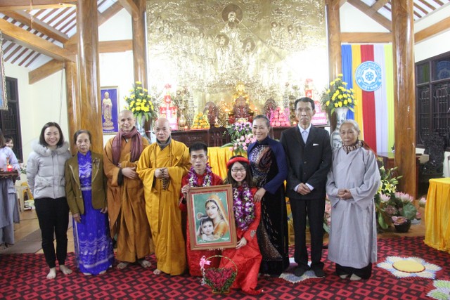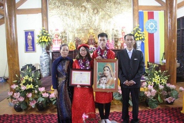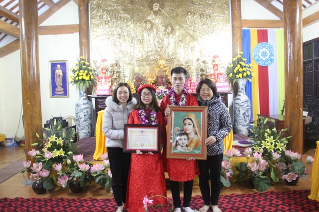 Buổi lễ có sự chứng minh của Thượng tọa trụ trì Thích Thanh Định cùng chư Tăng chùa Từ Xuyên, quý Phật tử đạo tràng Mai Tâm Tĩnh, họ hàng, bạn bè hai bên. Trước sự cầu nguyện gia hộ của quý thầy và toàn thể đạo tràng, hai đôi bạn trẻ đã kết duyên vợ chồng. Cả đạo tràng cùng cầu chúc tân lang tân nương “Sắt cầm hòa hợp – Loan phụng sum vầy – Bách niên giai lão”.