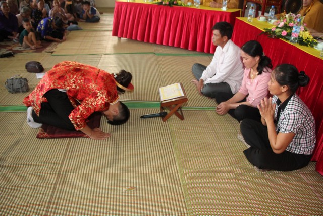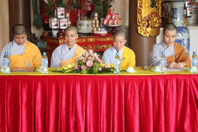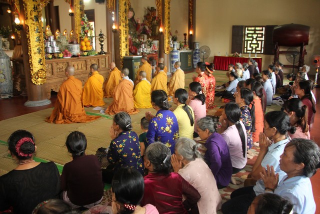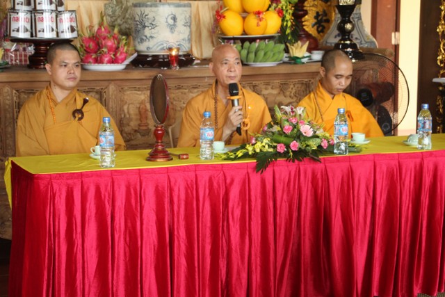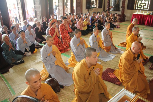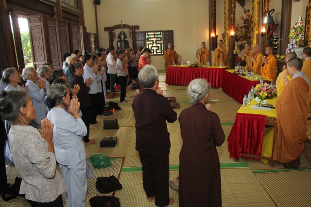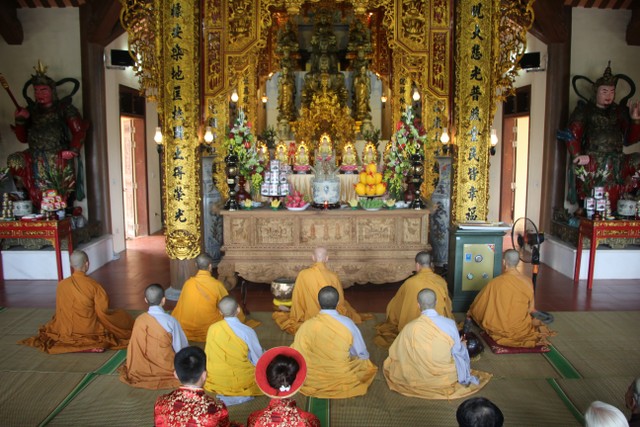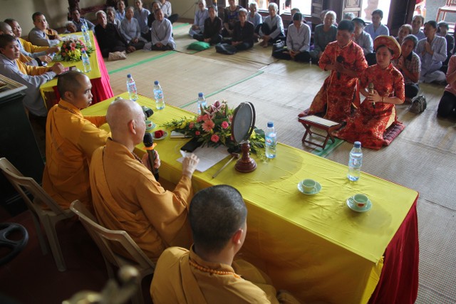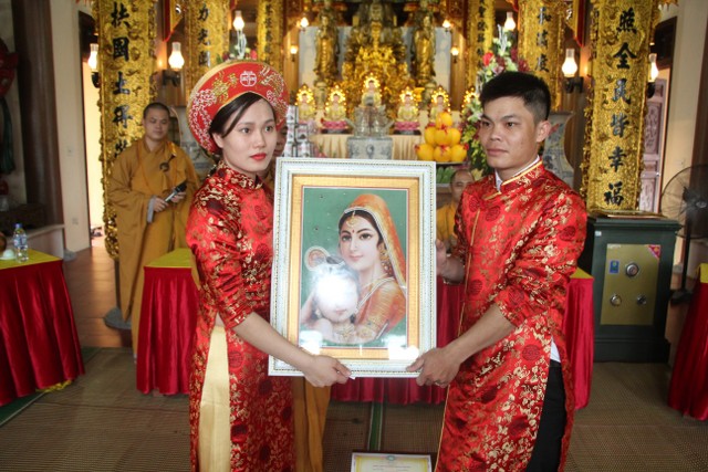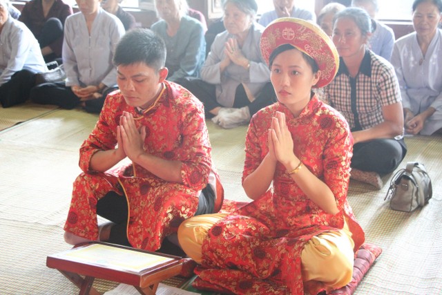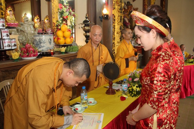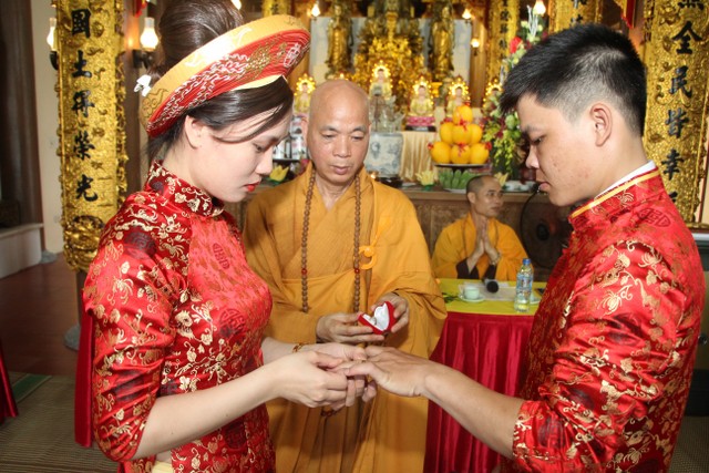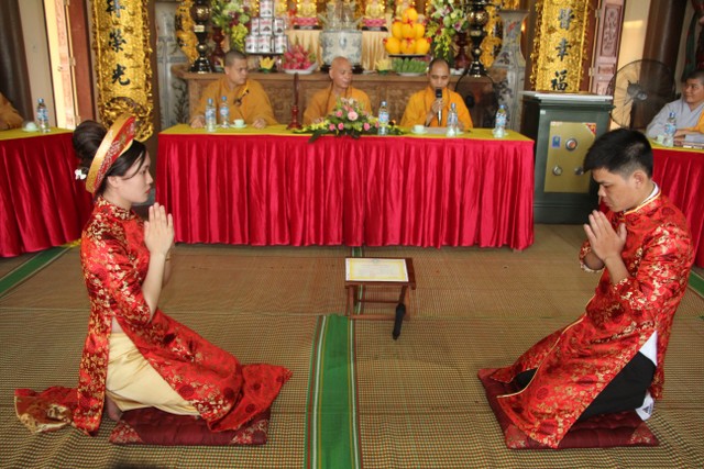 Trong không khí trang nghiêm, thành kính, chư tôn đức đã niêm hương bạch Phật, trì chú cầu nguyện và làm lễ quy y Tam Bảo để hai bạn lấy đó làm kim chỉ nam cho cuộc sống gia đình. Các bạn đã đối trước Tam Bảo lễ tạ tứ ân; đỉnh lễ công ơn sinh thành, dưỡng dục của song thân; đỉnh lễ tôn trọng sự bình đẳng của nhau. Sau đó, đích thân Thượng tọa chứng minh trao nhẫn và trao quà cưới cho hai bạn. Trong niềm hoan hỷ của buổi lễ, quý Thầy đã khuyến tấn tân lang, tân nương phải sống trọn vẹn bổn phận làm vợ và làm chồng, làm dâu hiền, rể thảo cùng xây dựng gia đình theo tinh thần kinh Thiện Sinh.