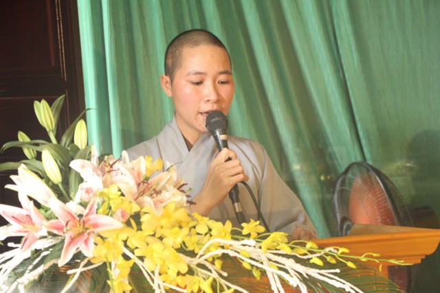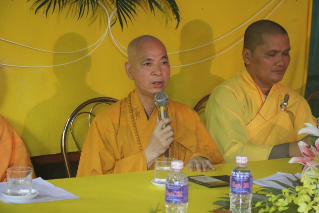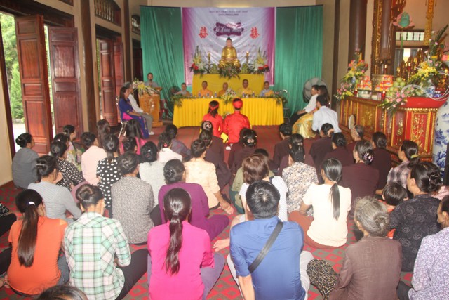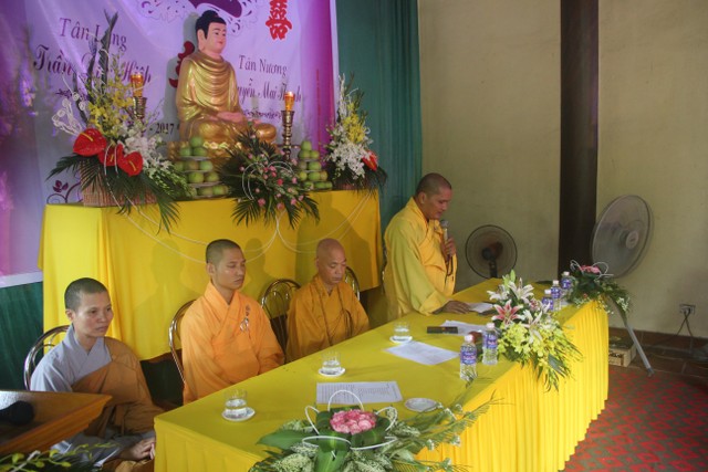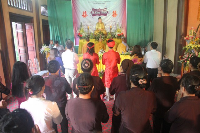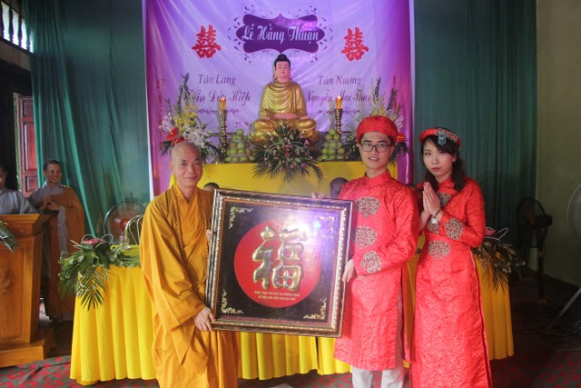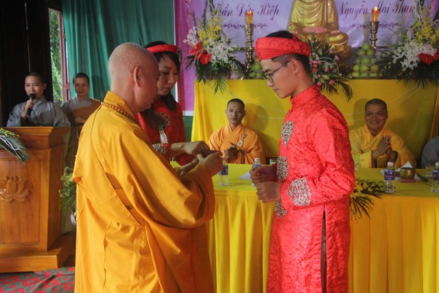 Trong không khí trang nghiêm, thành kính, chư tôn đức đã niêm hương bạch Phật, trì chú cầu nguyện và làm lễ quy y Tam Bảo để hai bạn lấy đó làm kim chỉ nam cho cuộc sống gia đình. Các bạn đã đối trước Tam Bảo lễ tạ tứ ân; đỉnh lễ công ơn sinh thành, dưỡng dục của song thân; đỉnh lễ tôn trọng sự bình đẳng của nhau. Sau đó, đích thân Thượng tọa chứng minh trao nhẫn và trao quà cưới cho hai bạn. Trong niềm hoan hỷ của buổi lễ, quý Thầy đã khuyến tấn tân lang, tân nương phải sống trọn vẹn bổn phận làm vợ và làm chồng, làm dâu hiền, rể thảo cùng xây dựng gia đình theo tinh thần kinh Thiện Sinh.